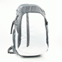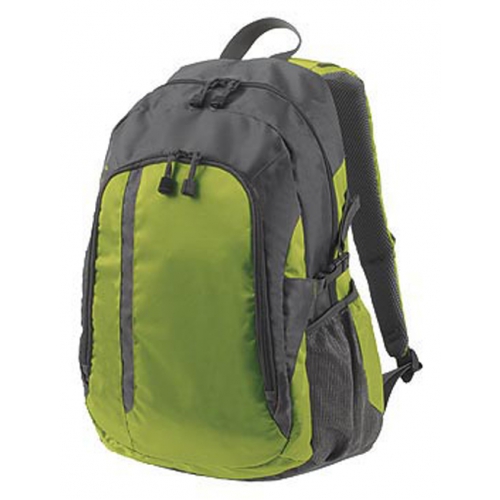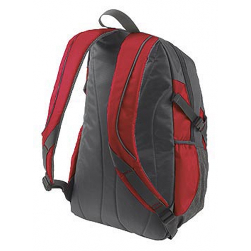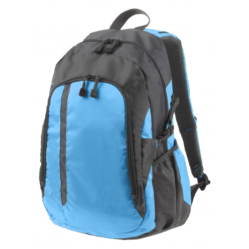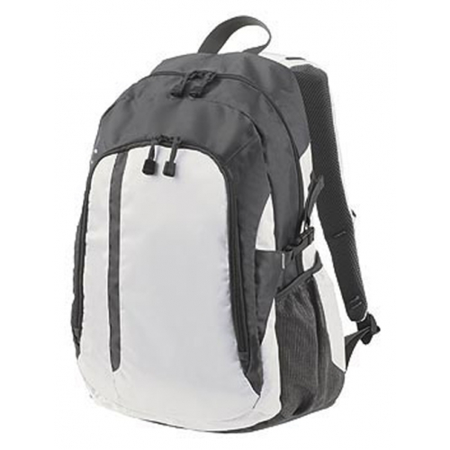 großes Hauptfach mit Einschubfach, seitliche Netztaschen und Zurrgurte, große Reißverschluss-Vortasche mit Einsteckfächern und Kopfhörerausgang, aufwändig gestaltete und gepolsterte Schultergurte
