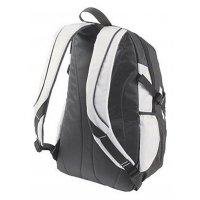 großes Hauptfach mit Einschubfach, seitliche Netztaschen und Zurrgurte, große Reißverschluss-Vortasche mit Einsteckfächern und Kopfhörerausgang, aufwändig gestaltete und gepolsterte Schultergurte