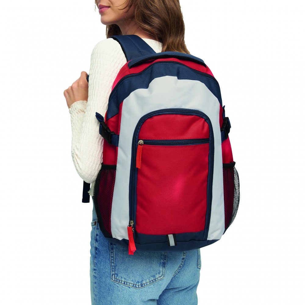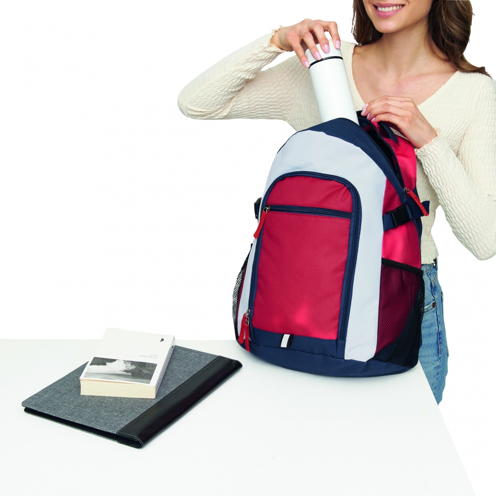 Artikel-Nr: INP56-0219546Rucksack MARINA: Reißverschluss-Hauptfach, Reißverschluss-Vortasche mit extra Reißverschluss-Fach, 2 seitliche Netzeinsteckfächer, seitliche Kompressionsgurte, verstärkter Tragegriff, gepolsterte Schultergurte und Rückenbereich