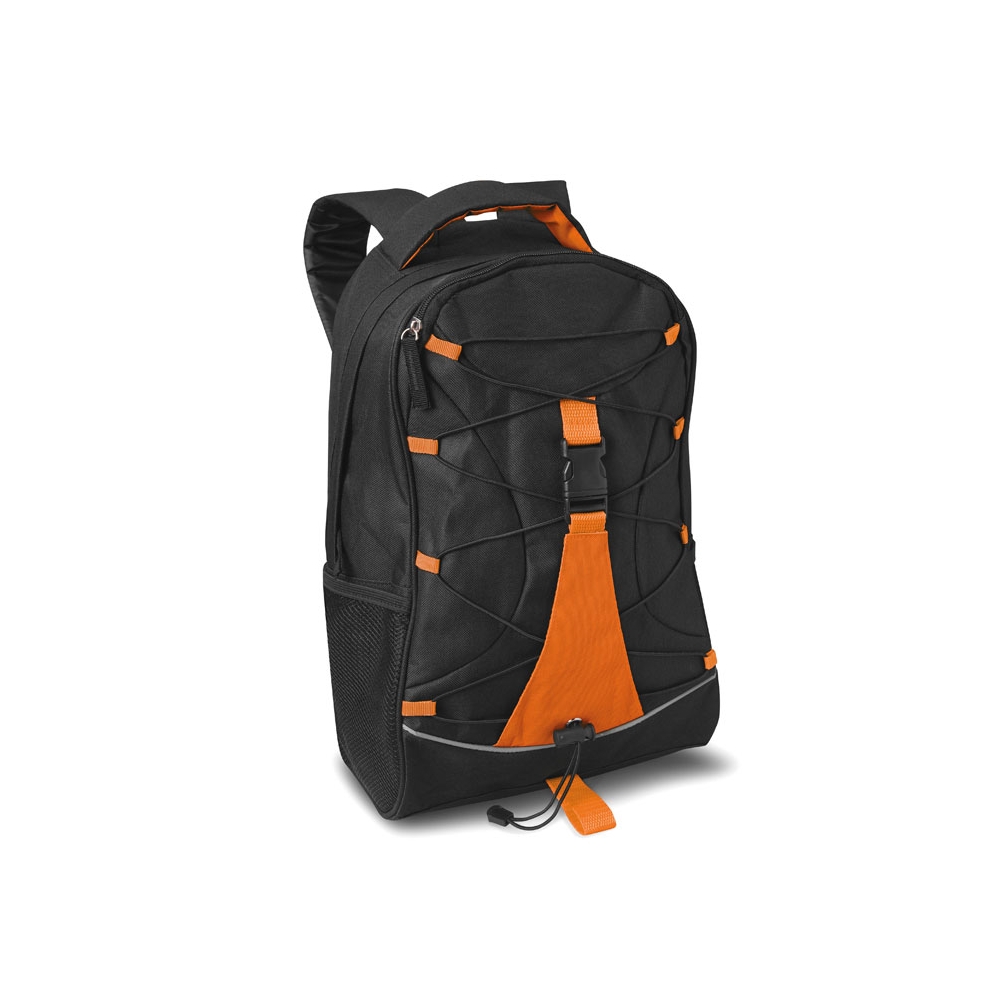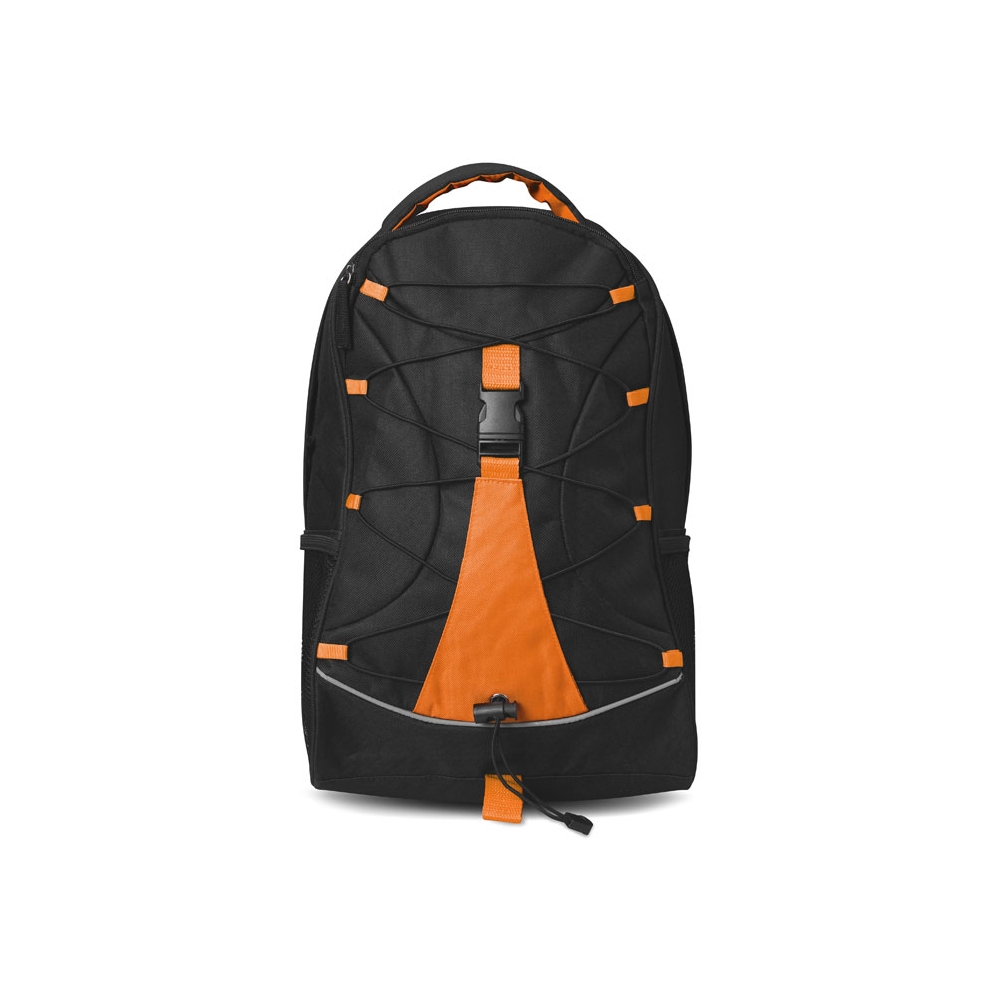 Artikel-Nr: OCBMO7558-10Schwarzer Rucksack mit farbigen Applikationen. Schnürung auf der Vorderseite. Netztaschen an den Seiten. 600D Polyester.