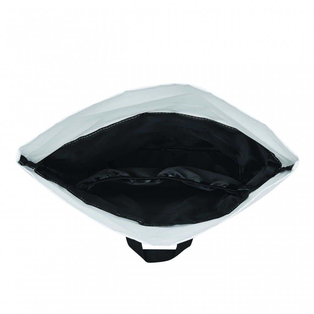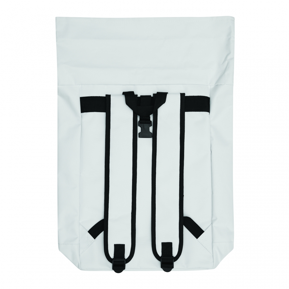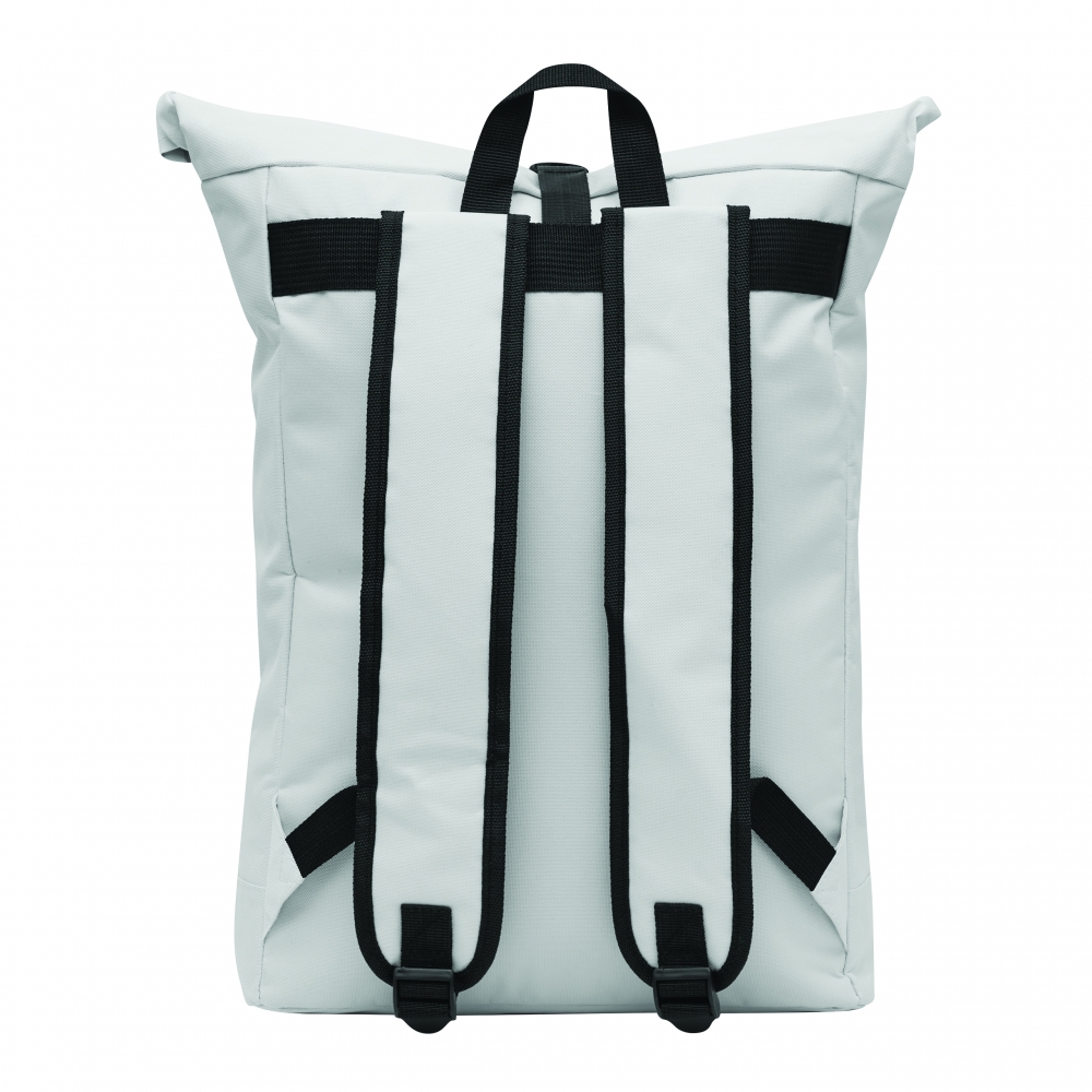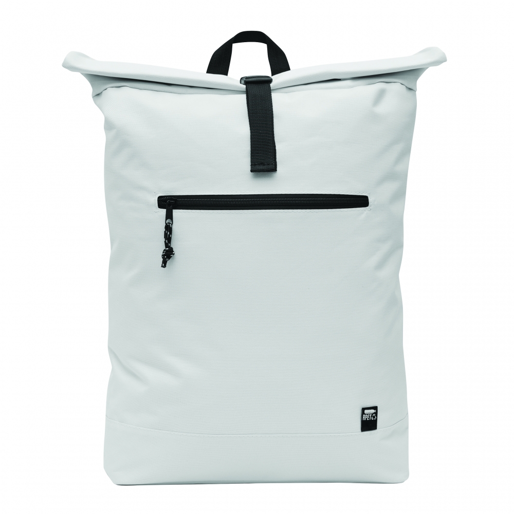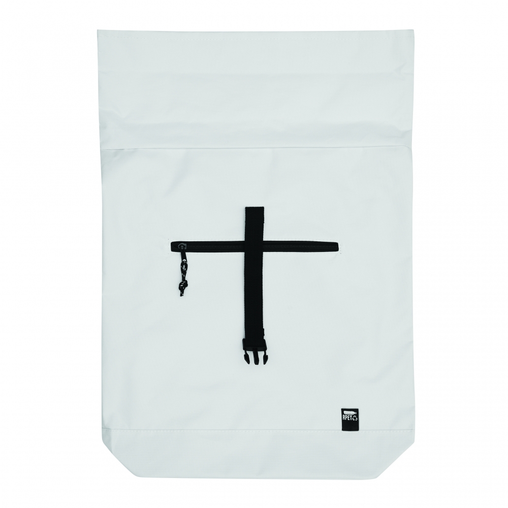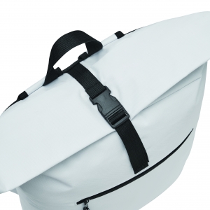 Artikel-Nr: INP56-0819704Rucksack ROLL-TOP: aus recyceltem Kunststoff (RPET), horizontales Reißverschluss-Vorfach, großes Hauptfach mit gepolstertem Innenfach für Laptop oder Tablet, aufrollbar und mit Schnappverschluss verschließbar, Trageschlaufe, gepolsterter Boden, Schultergurte und Rückenbereich