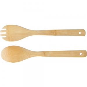 Artikel-Nr: GIV1041500011Salatbesteck aus Bambus. Das Besteck hat Löcher an den Enden des Griffs. Verpackt in Baumwollbeutel mit Kordelzug.