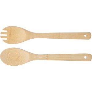 Artikel-Nr: GIV1041500011Salatbesteck aus Bambus. Das Besteck hat Löcher an den Enden des Griffs. Verpackt in Baumwollbeutel mit Kordelzug.