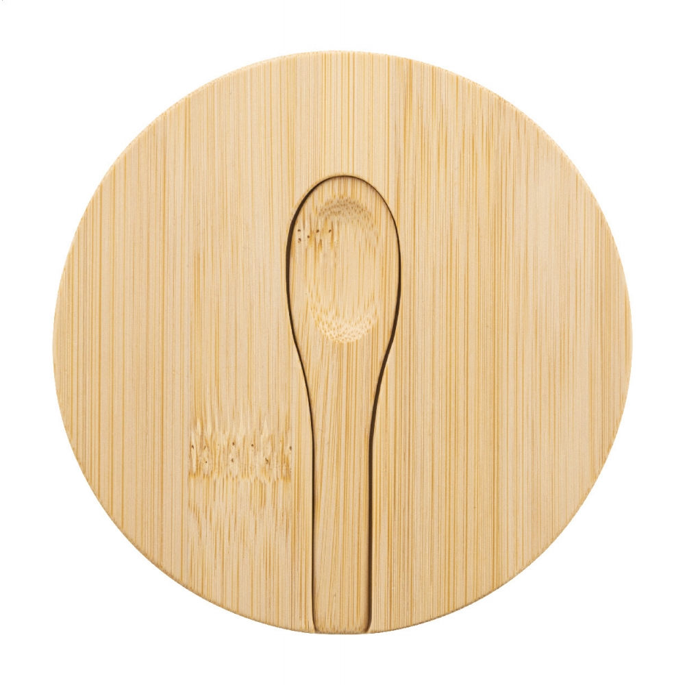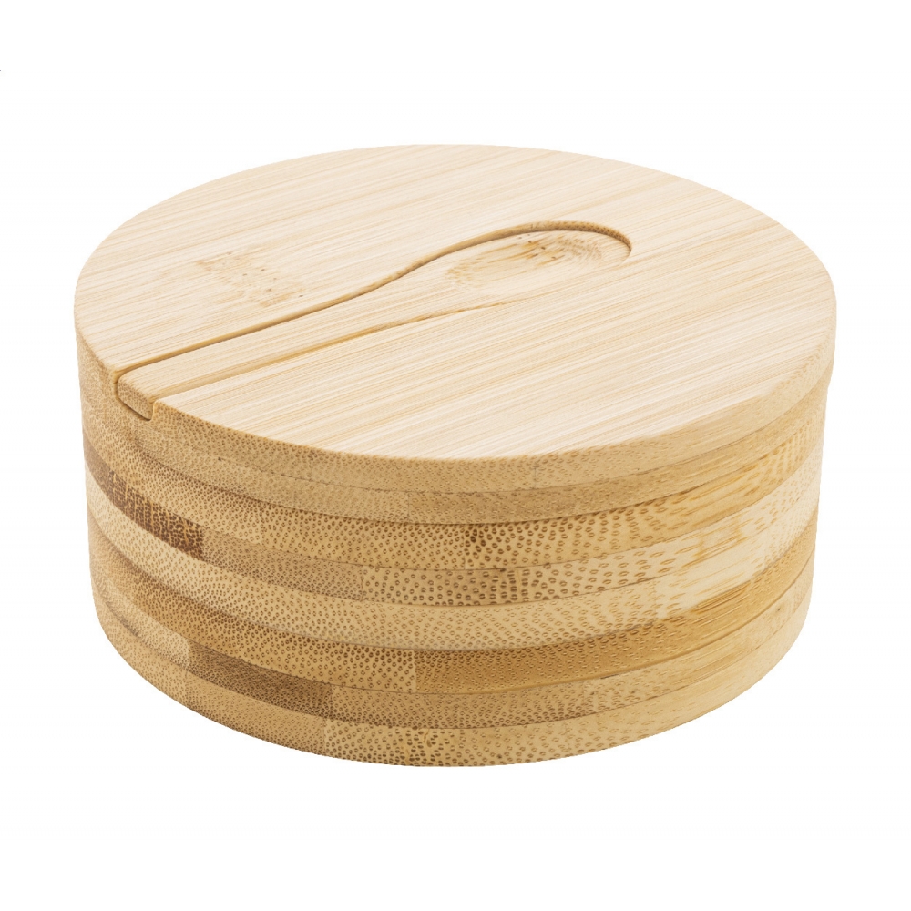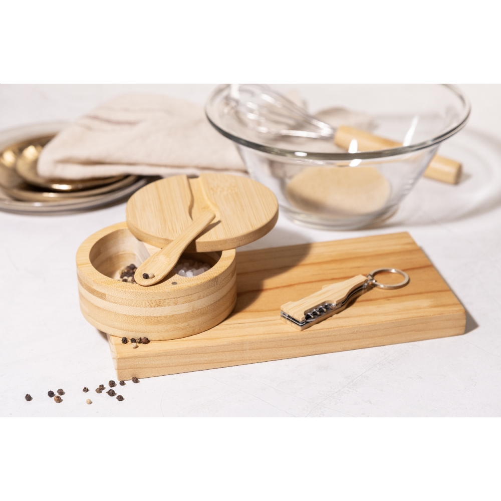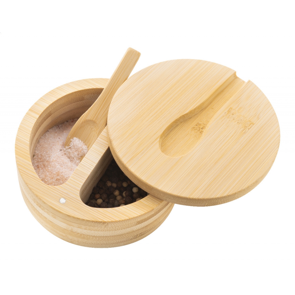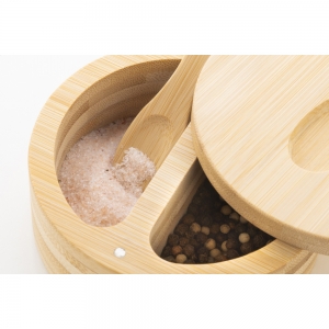 Artikel-Nr: AND800031Salz- und Pfefferstreuer aus Bambus mit zwei Fächern und magnetischem Drehdeckel. Inklusive integriertem Servierlöffel.