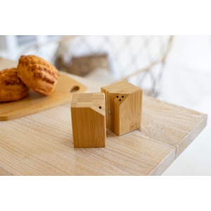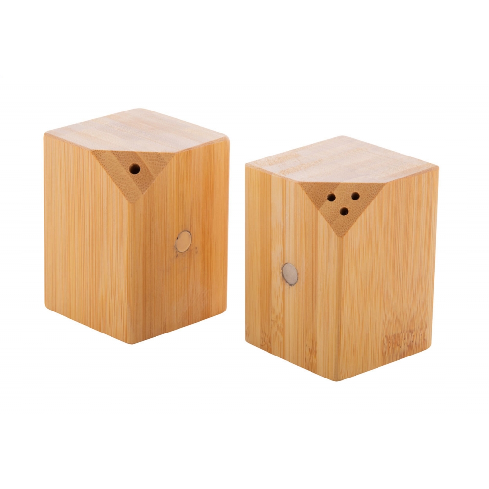 Artikel-Nr: AND8004762-teiliges Salz- und Pfefferstreuer-Set aus Bambus. Die beiden Streuer haften mittels seitlich angebrachter Magneten an einahder.