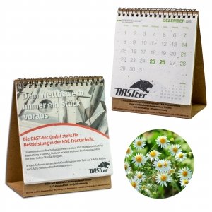 Artikel-Nr: HOP11.41632.00-kamIn einer hektischen Welt, in der wir uns oft von der Natur entfremden, ist es wichtiger denn je, sie in unseren Alltag zu integrieren. Unser Samenpapier Tischkalender bietet eine einzigartige Verbindung zwischen Funktionalität und Naturverbundenheit. Der Fuß besteht aus Kraftpapier, die Vorder- und Rückseite werden individuell bedruckt. Die erste Seite der 7 Samenpapier-Blätter wird vollflächig individuell bedruckt. Auf den Monatsseiten ist jeweils ein Druckfeld in der Größe von 92 x 37 mm individuell bedruckbar (ein Motiv für alle Seiten).Alle 7 Samenpapierseiten enthalten denselben Samen. Zur Auswahl stehen die Samen von Minze, Lavendel, Kamille, Rudbeckia, Mohn, Gänseblümchen, Wildblumenmischung, Karotte oder Tomate. Wenn das Kalenderblatt nicht mehr benötigt wird, kann es eingepflanzt werden und man schenkt seiner Umgebung eine kleine, grüne Oase des Glücks und der Achtsamkeit.