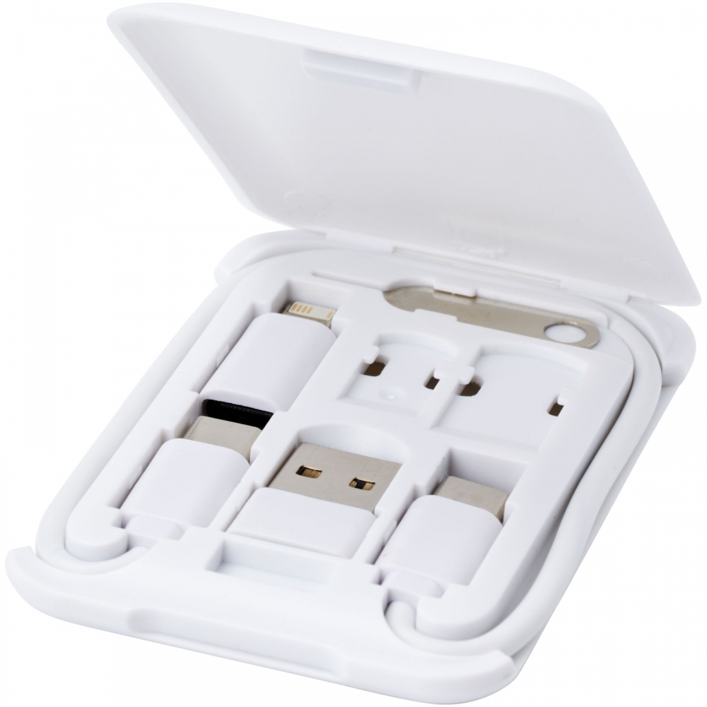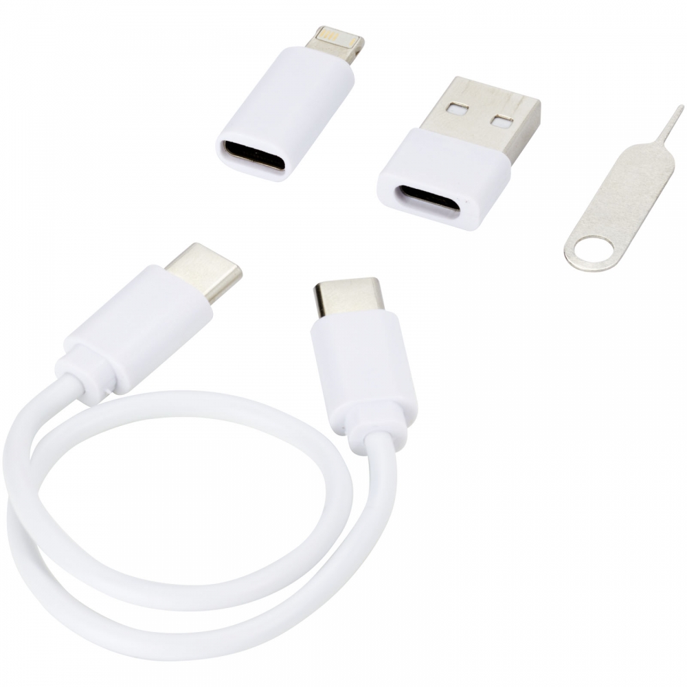 Artikel-Nr: CPO12436101Modulares Datenübertragungs- und Ladekabel aus recyceltem Kunststoff, geliefert in einer eleganten Aufbewahrungsbox, die auch als Telefonladestation dient. Das Kabel bietet mehrere Ladelösungen: Typ-C- und USB-A-Eingang und Typ-C / iOS / Micro-USB-Ausgang. Dank all dieser Adapter und Anschlüsse können Sie mit diesem Kabel die meisten Smartphones, Kameras, Powerbanks, Ohrhörer usw. aufladen. Das Kabel hat eine maximale Ausgangsleistung von 2 A. Sie verfügt über einen Auswurfstift, der immer dann nützlich ist, wenn Sie die SIM-Karte Ihres Telefons herausnehmen müssen. Die Aufbewahrungsbox bietet außerdem Platz für eine Micro-SD-Speicherkarte sowie eine Nano-SIM-Karte und ist damit das perfekte Reisezubehör. Länge des Kabels: 26 cm. Wird in einem Umschlag aus 100% recyceltem Kraftpapier geliefert.