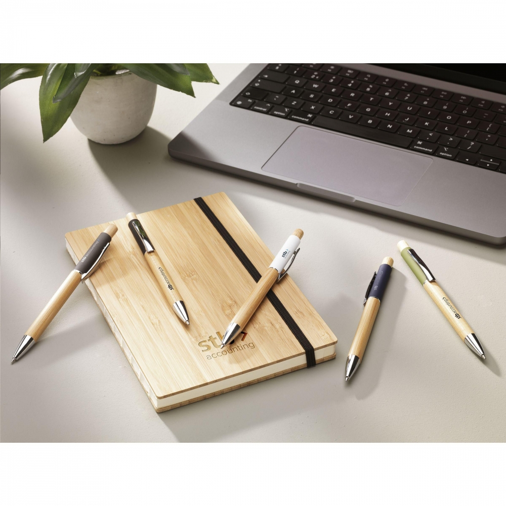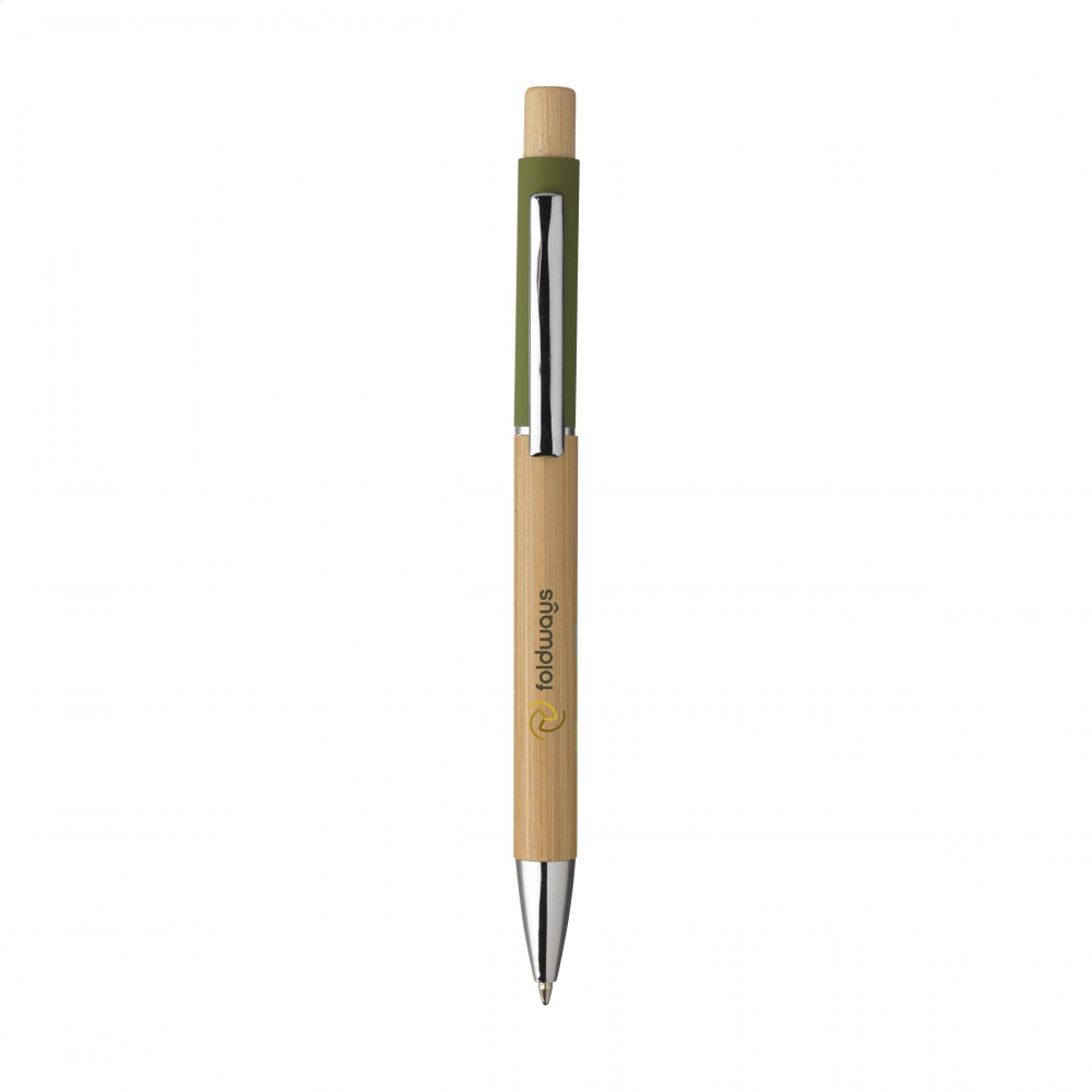 Artikel-Nr: CLP261473-004128Blauschreibender Kugelschreiber mit schönem Gehäuse und Druckknopf aus FSC 100% zertifiziertem Bambus. Metallclip. Die Aluminiumoberseite des Halters ist mit einer gummierten Oberfläche versehen.
