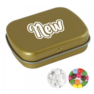 Artikel-Nr: PRM501100_16Scharnierblechdose 62 x 50 x 17 mm mit ca. 25 gr. Minties, TAMPONDRUCK, erhältlich in einer großen Farbenvielfalt mit verschiedenen Füllungen: Minties, extra strong Minties `Triangle`, Schokocarletties, Jelly Beans, Fruchtherzchen, Schokoperlen gold, knuspriger Schokoladen festival, knusprige schokoladen Juwelen, goldglitzer Milchschokolade, kleine Herzen gold, kleine Herzen rot / weiß, marmorgold Schoko dunkel, mikro Milchschokoladeneier, mini Schokoperlen gold, mini Schokoperlen kupfer, roseglitzer Milchschokolade, silberglitzer Milchschokolade oder sommerkonfetti Schoko dunkel.