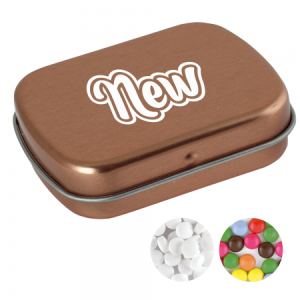 Artikel-Nr: PRM501100_16AScharnierblechdose 62 x 50 x 17 mm mit ca. 25 gr. Minties, TAMPONDRUCK, erhältlich in einer großen Farbenvielfalt mit verschiedenen Füllungen: Minties, extra strong Minties `Triangle`, Schokocarletties, Jelly Beans, Fruchtherzchen, Schokoperlen gold, knuspriger Schokoladen festival, knusprige schokoladen Juwelen, goldglitzer Milchschokolade, kleine Herzen gold, kleine Herzen rot / weiß, marmorgold Schoko dunkel, mikro Milchschokoladeneier, mini Schokoperlen gold, mini Schokoperlen kupfer, roseglitzer Milchschokolade, silberglitzer Milchschokolade oder sommerkonfetti Schoko dunkel.