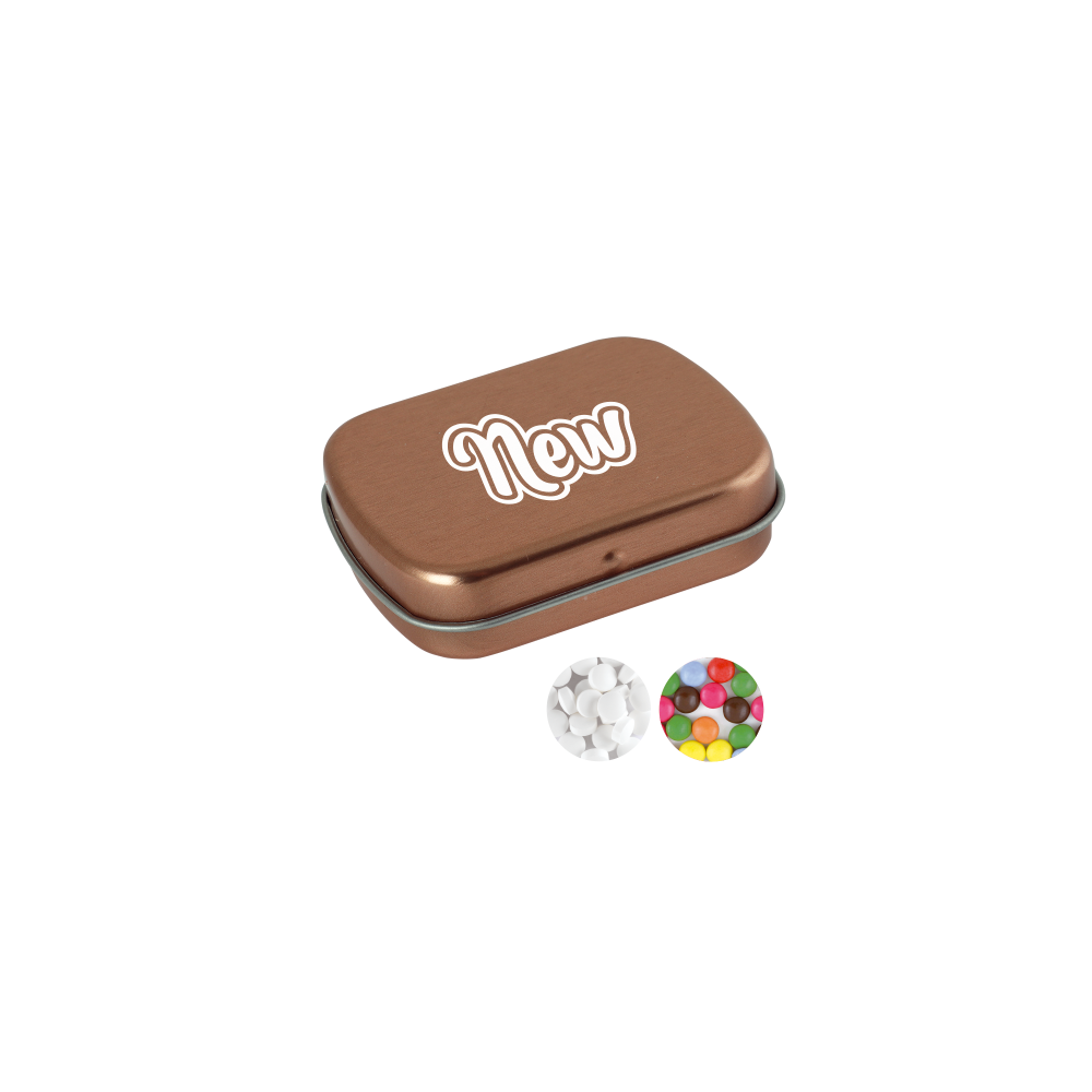 Artikel-Nr: PRM501100_16AScharnierblechdose 62 x 50 x 17 mm mit ca. 25 gr. Minties, TAMPONDRUCK, erhältlich in einer großen Farbenvielfalt mit verschiedenen Füllungen: Minties, extra strong Minties `Triangle`, Schokocarletties, Jelly Beans, Fruchtherzchen, Schokoperlen gold, knuspriger Schokoladen festival, knusprige schokoladen Juwelen, goldglitzer Milchschokolade, kleine Herzen gold, kleine Herzen rot / weiß, marmorgold Schoko dunkel, mikro Milchschokoladeneier, mini Schokoperlen gold, mini Schokoperlen kupfer, roseglitzer Milchschokolade, silberglitzer Milchschokolade oder sommerkonfetti Schoko dunkel.