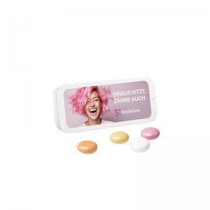 Artikel-Nr: PUC1116.00012Flache weiße Schiebedeckeldose, aus Weißblech 98% recylebar, individuell bedruckt. Inhalt: Mentos Kaudragee Fruit (Erdbeere, Orange, Zitrone - gemischt), 13 g