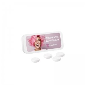 Artikel-Nr: PUC1116.00013Flache weiße Schiebedeckeldose, aus Weißblech 98% recylebar, individuell bedruckt. Inhalt: Mentos Kaudragee Mint, 13 g