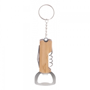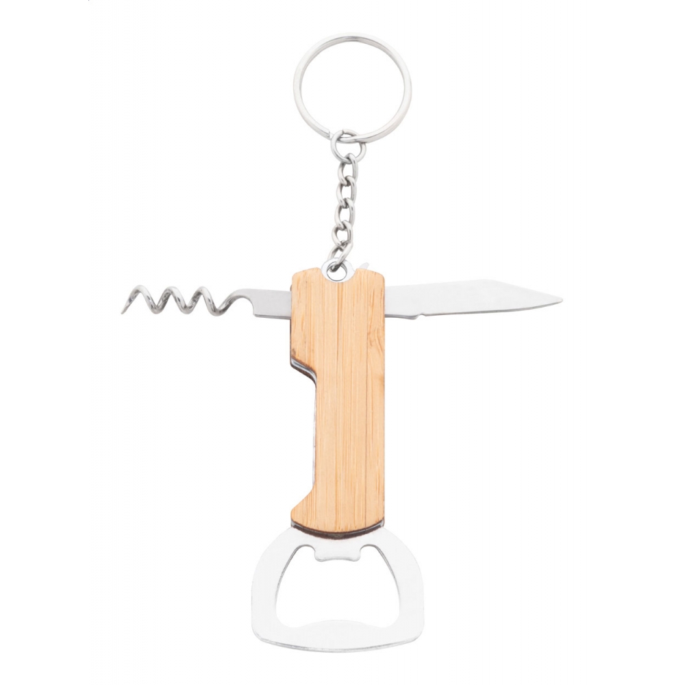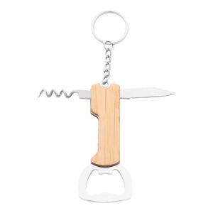 Artikel-Nr: AND808151Schlüsselanhänger aus Edelstahl und Bambus mit Flaschenöffner, Korkenzier und Taschenmesser.