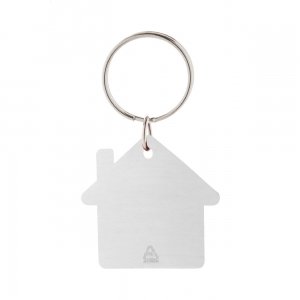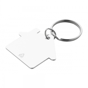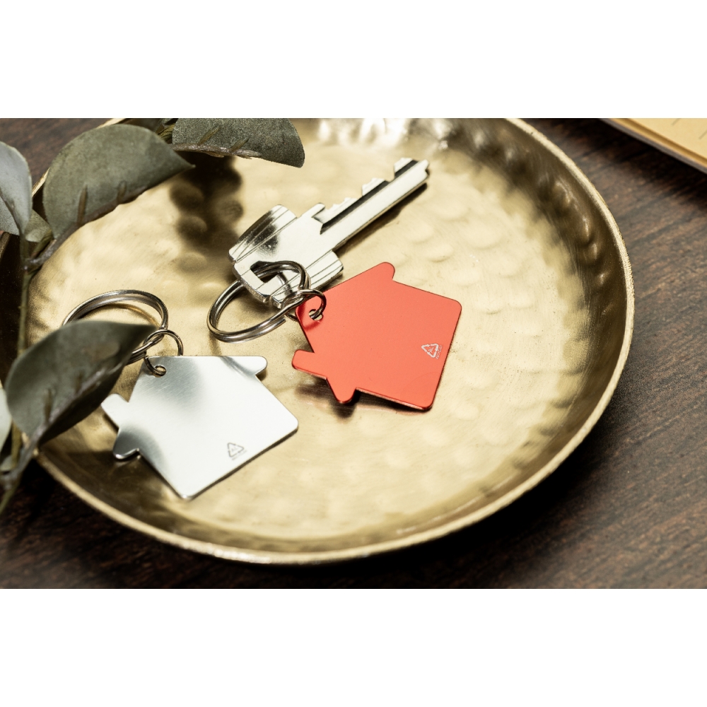 Artikel-Nr: AND800104-21Schlüsselanhänger aus recyceltem Aluminium in Hausform mit Metallring.