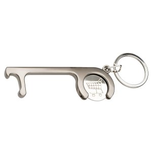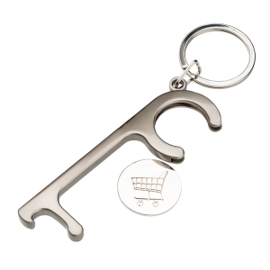 Artikel-Nr: RFS10356-MMit dem Schlüsselanhänger MY-CADDY-DISTANCE ist das Berühren von stark frequentierten Oberflächen vermeidbar. Ob Aufzugstasten, Pin-Eingabetasten oder Türklinken - durch die Nutzung des Hygiene-Schlüsselanhängers müssen keine dieser Oberflächen mit den Händen berührt werden. Ebenso verfügt MY-CADDY-DISTANCE über einen Flaschenöffner und einen Einkaufswagenchip. So sind viele praktische Funktionen an einem Schlüsselanhänger vereint. Als Lagerartikel ist er verfügbar in matt silber mit silberglänzendem Chip aus vernickeltem Eisen. Der 1,5 – 1,6mm starke Chip (nach dt. Münzgesetz) ist einseitig mit einer Prägung veredelt. Für eine Individualisierung des Schlüsselanhängers und besonders des Chips kontaktieren Sie unseren Vertrieb. Einzeln verpackt ist MY-CADDY-DISTANCE im transparenten Polybeutel mit informativer Einlegekarte.