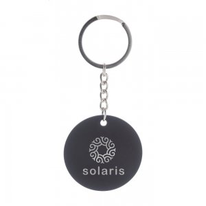 Artikel-Nr: AND808270-10Runder Schlüsselanhänger aus recyceltem Edelstahl mit gummierter Oberfläche undspezieller Beschichtung für Spiegelgravuren.