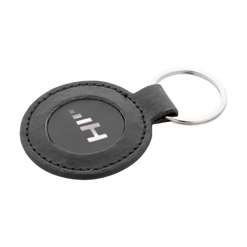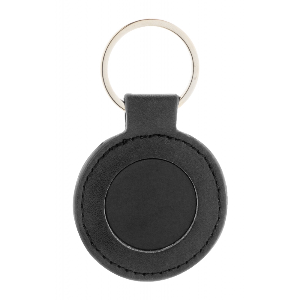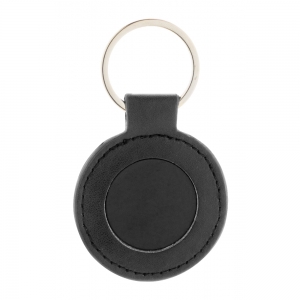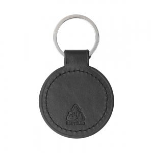 Artikel-Nr: AND800195-10Runder Schlüsselanhänger aus recyceltem PU-Leder mit Metallring und Logoplatte aus Edelstahl mit gummierter Oberfläche. Mit Spezialbeschichtung für Spiegelgravur.