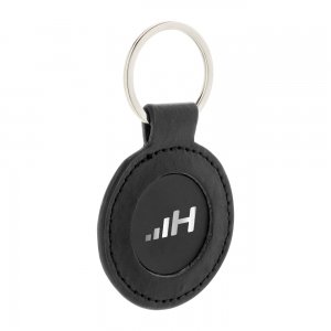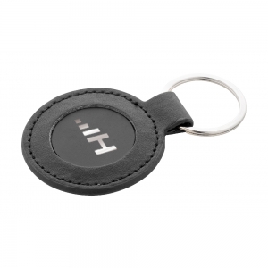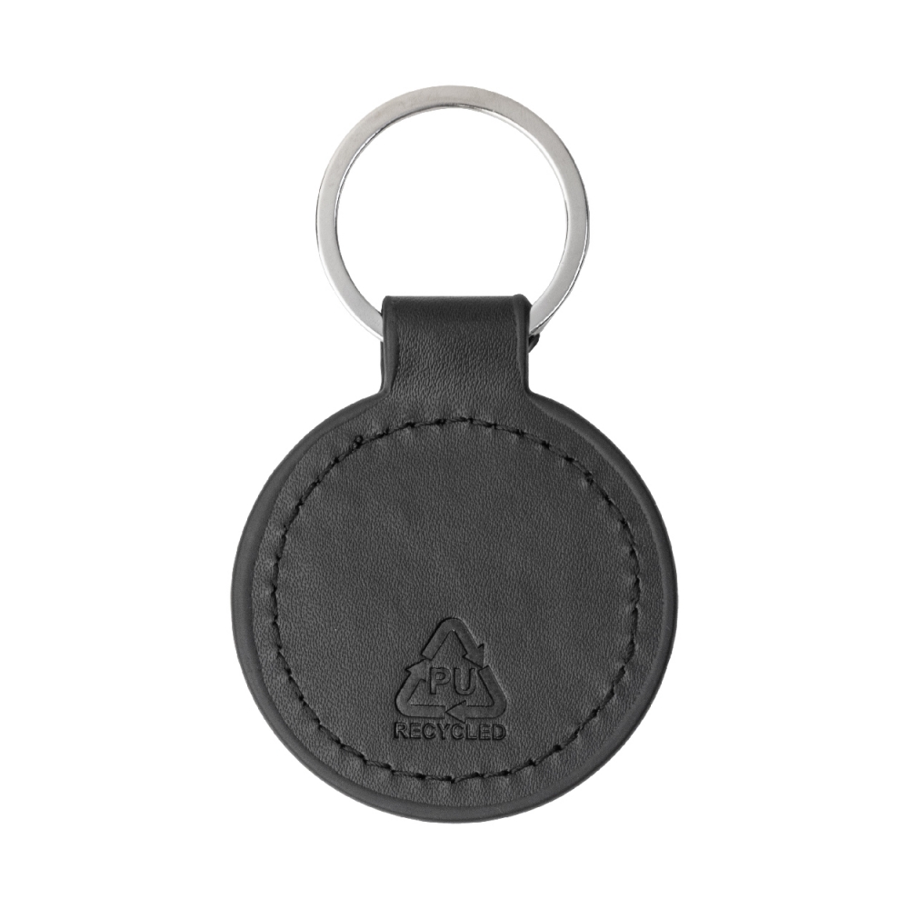 Artikel-Nr: AND800195-10Runder Schlüsselanhänger aus recyceltem PU-Leder mit Metallring und Logoplatte aus Edelstahl mit gummierter Oberfläche. Mit Spezialbeschichtung für Spiegelgravur.