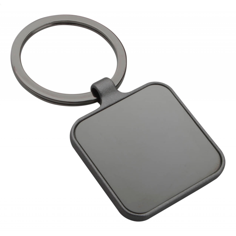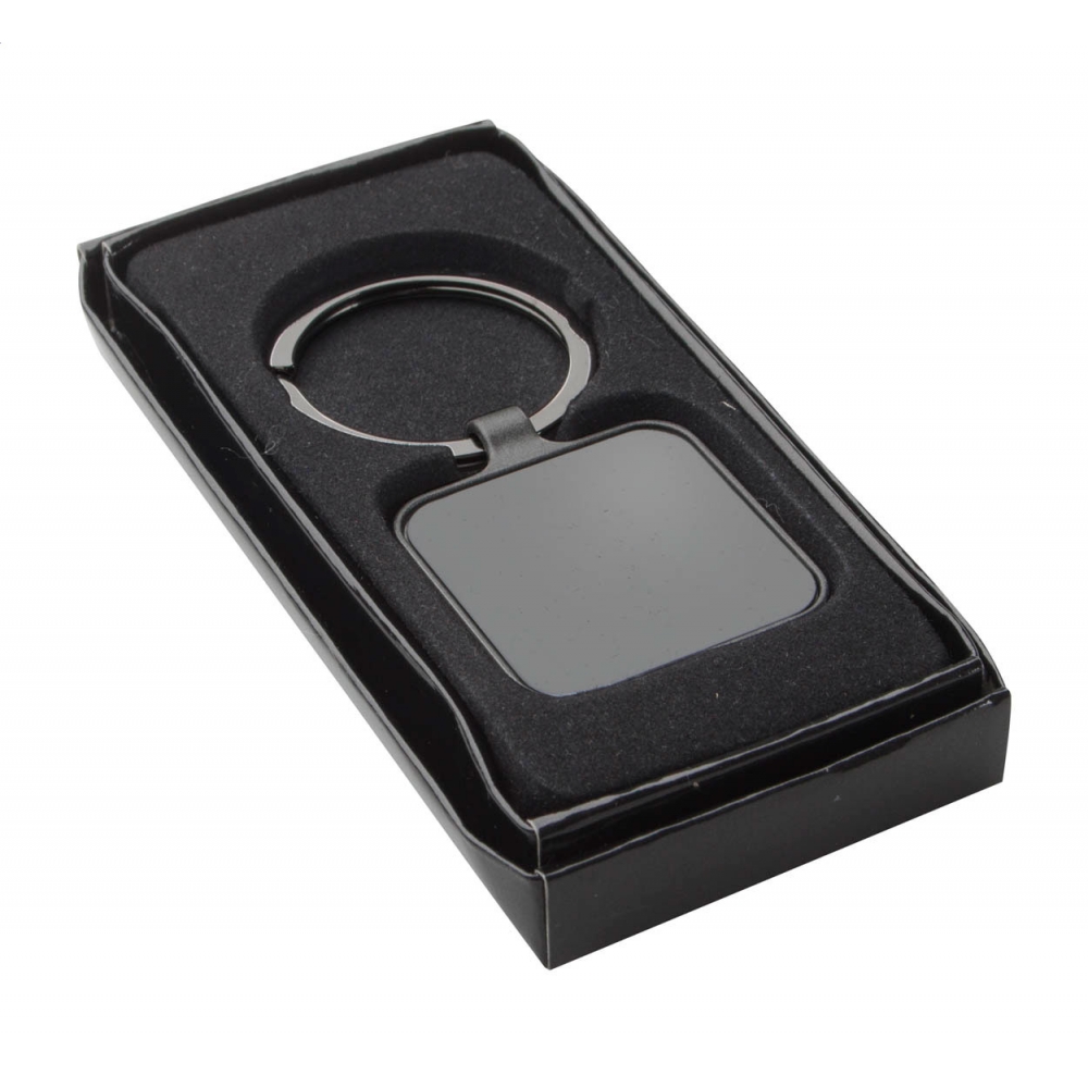 Artikel-Nr: AND873021Quadratischer Schlüsselanhänger aus Metall mit Gun-Metal-Oberfläche und polierten Plättchen auf beiden Seiten. Einzeln in schwarzer Geschenkbox.
