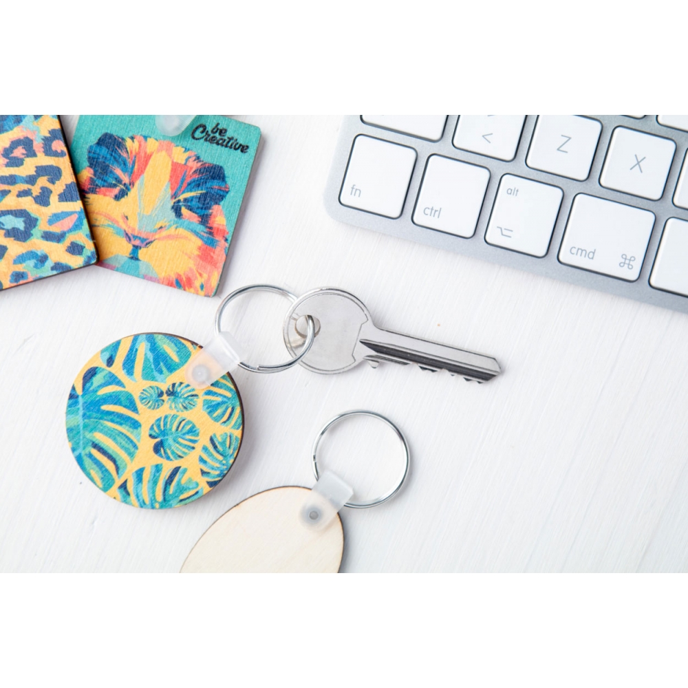 Artikel-Nr: AND718153Runder Schlüsselanhänger aus laminiertem Holz (Birke) mit Vollfarbdruck. Preis inklusive UV LED Druck auf einer Seite. Mindestmenge: 200 Stk.