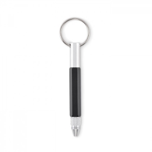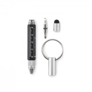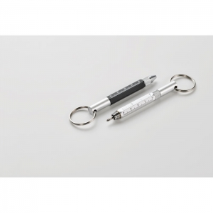 Artikel-Nr: OCBMO2529-03Schlüsselring mit Drehkugelschreiber aus recyceltem Aluminium, Stylus, Lineal 4 cm/1,5 Zoll und 2in1 Phillips- und Flachkopfschraubendreher. Schwarze Tinte.