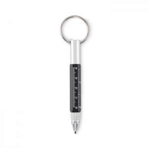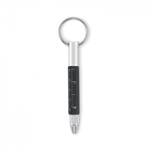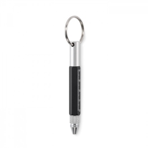 Artikel-Nr: OCBMO2529-03Schlüsselring mit Drehkugelschreiber aus recyceltem Aluminium, Stylus, Lineal 4 cm/1,5 Zoll und 2in1 Phillips- und Flachkopfschraubendreher. Schwarze Tinte.
