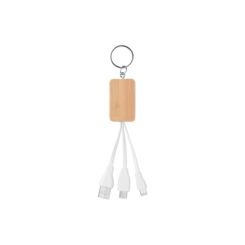 Artikel-Nr: OCBMO9888-40Schlüsselring mit Anhänger aus Bambus und Ladekabel USB-A, Mikro-B (2-in-1) und Typ-C. Bambus ist ein natürliches Produkt, es kann daher zu leichten Abweichungen in Farbe, Dekor und Maßen kommen..