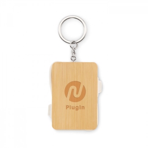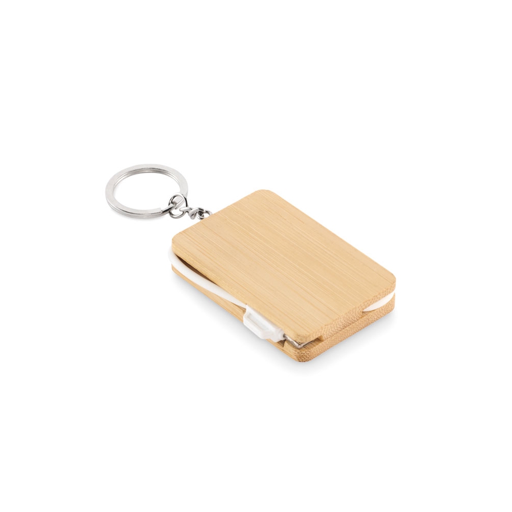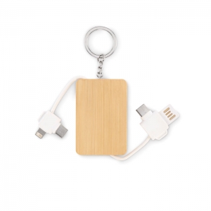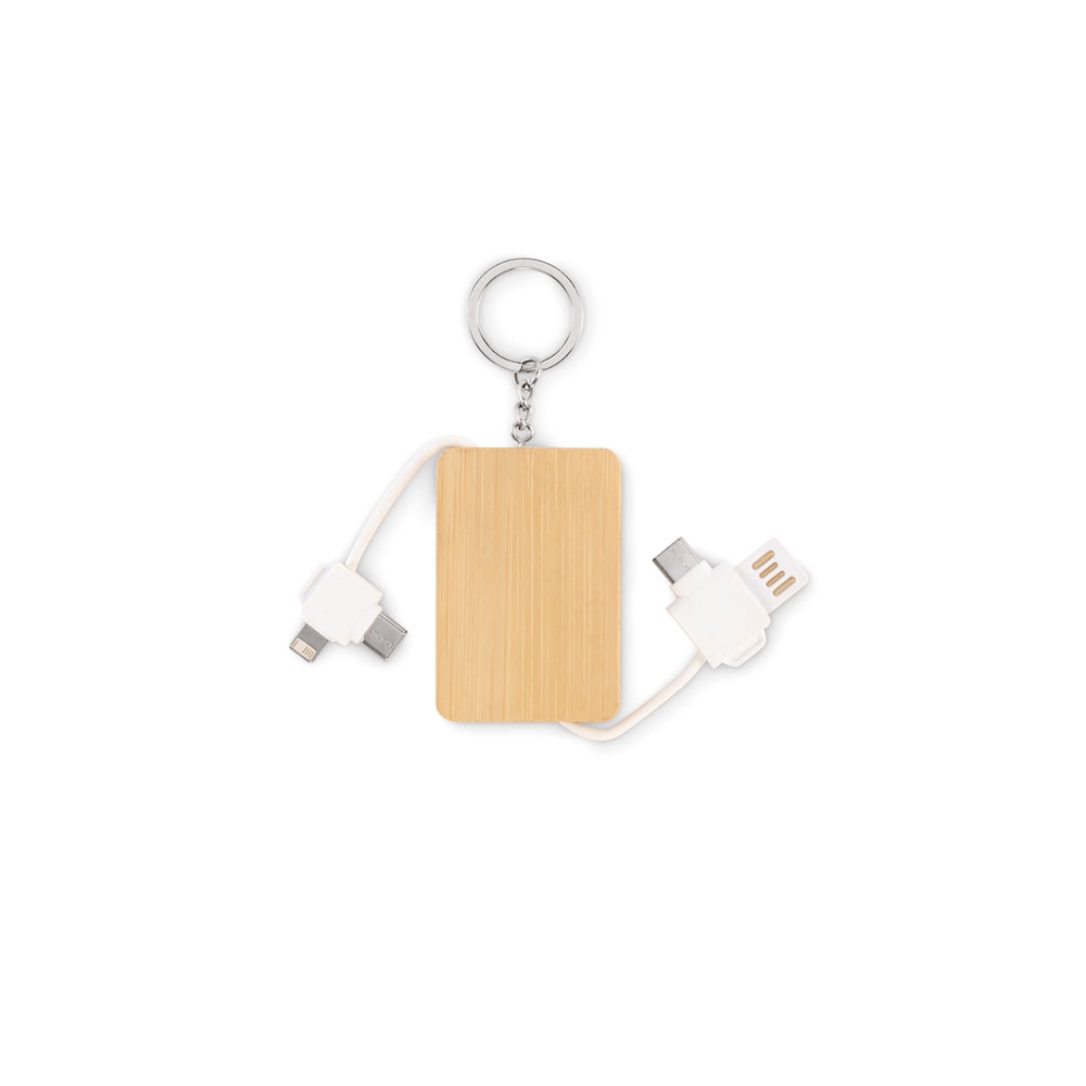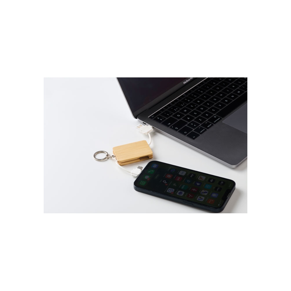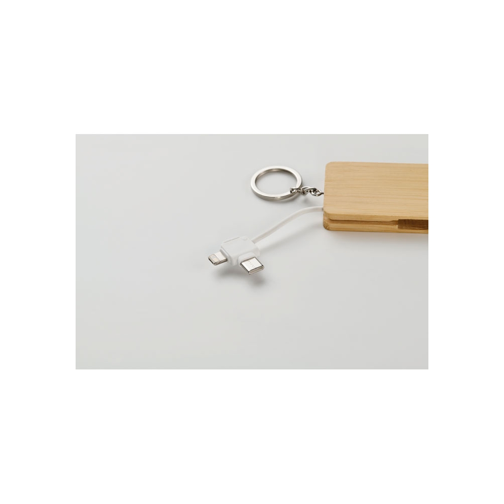 Artikel-Nr: OCBMO2422-40Schlüsselring mit Ladekabel. Bambus-Cover. Eingang: 2-in-1 Typ-C und Typ-A. Ausgang: Typ-C und Mikro-B (2 in 1 Pin).