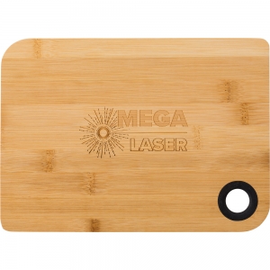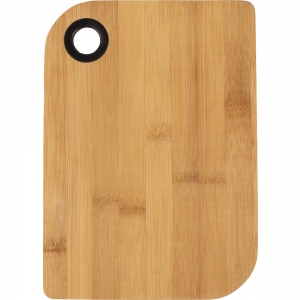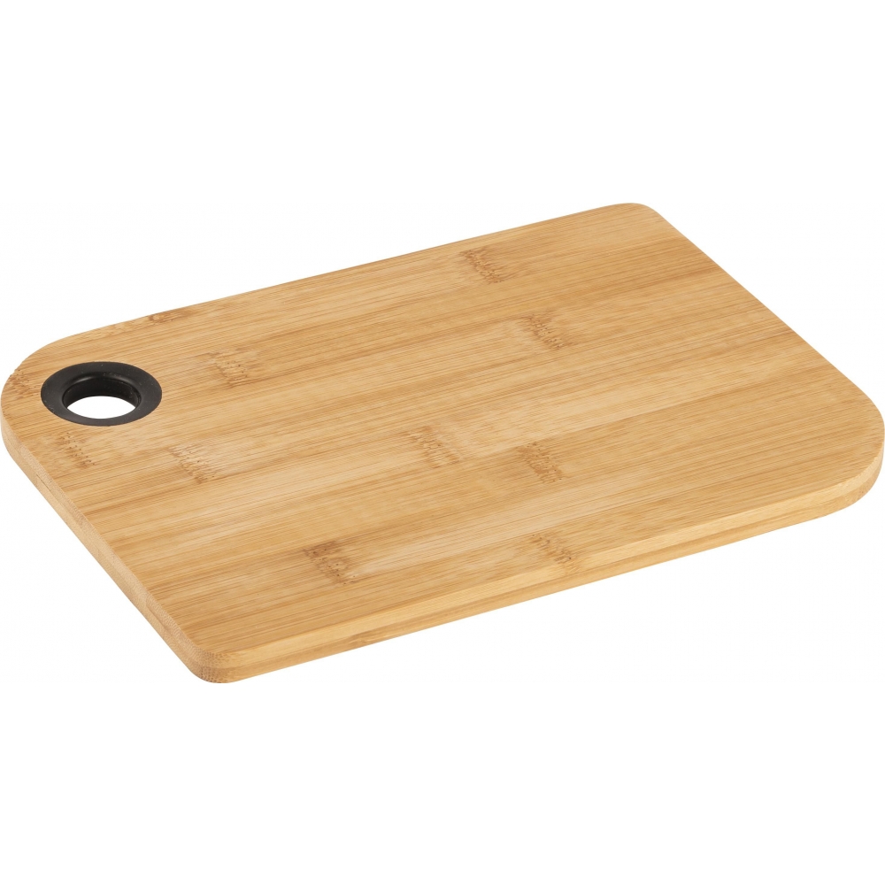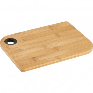 Artikel-Nr: GIV8890011Schneidebrett aus Bambus 'Steven'. Das Loch für den Daumen ist umrandet mit einem Silikonring.