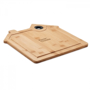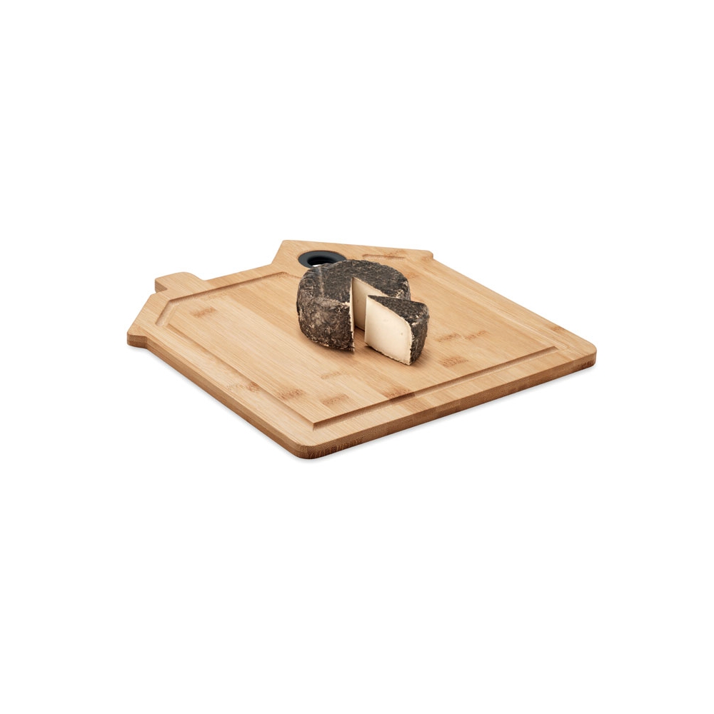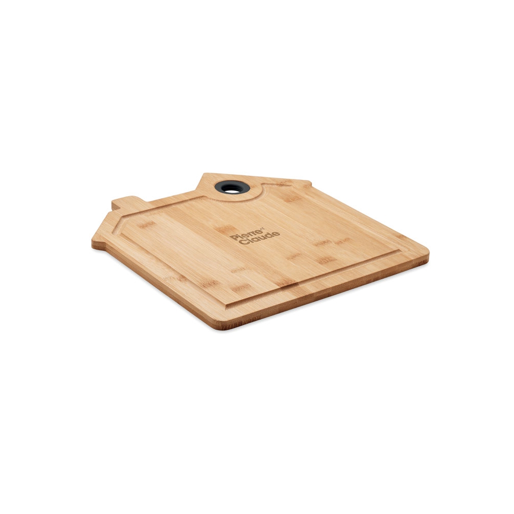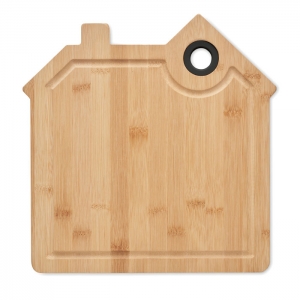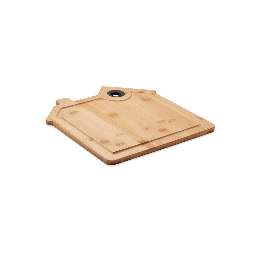 Artikel-Nr: OCBMO6859-40Schneidebrett aus Bambus mit Saftrille. In Optik eines Hauses. Inkl. Aussparung zum praktischen Aufhängen. Bambus ist ein natürliches Produkt, es kann daher zu leichten Abweichungen in Farbe, Dekor und Maßen kommen.