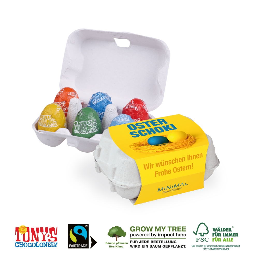 Artikel-Nr: CDL94657Die faire Kultschokolade! Nachhaltig, fair und obendrein ein Hochgenuss! Das sind die leckeren Tony's Schokoeier im Präsentkarton. Der individuell bedruckbare Werbeschuber bietet den perfekten Platz für Ihre Werbung und Ihre Ostergrüße.