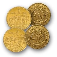 Vollmilchschokolade in Folienverpackung. Ihr Logo wird beidseitig in die Verpackungsfolie geprägt. Folienfarben: gold, silber Größe: Ø 38 mm Individualisierung: Prägung