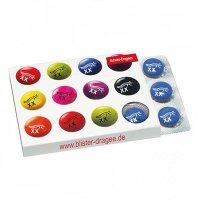 Zusätzlich gestalten wir die Verpackung nach Ihren Vorgaben. Die Linsen gibt es in vielen verschiedenen Farben und auf Wunsch können wir den Blister der Schokolinsen auch auf der Rückseite bedrucken.