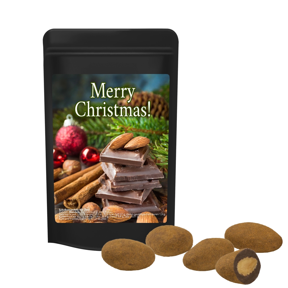 Artikel-Nr: FNM02089Standbeutel Mini schwarz. Werbeanbringung als Etikett in 4c individuell bedruckbar. Zutaten Schokomandeln mit Zimt: 67% Vollmilchschokolade (Zucker, Vollmilchpulver, Kakaomasse, Kakaobutter, Molkenpulver, Emulgator: Sojalecithin; natürliches Vanillearoma), 30% Mandelkerne (98% Mandeln, Sonnenblumenöl), 2% Zimt, Überzugsmittel: Glucosesirup, Emulgator: Gummi arabicum.