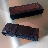 Artikel-Nr: P597Hochwertiges Schreibgeräte-Etui aus schwarzem Leder. In diesem handlichen Schreibgeräte-Etui, dass durch eine Überschlaglasche geschlossen wird, ist Platz für zwei Stifte.