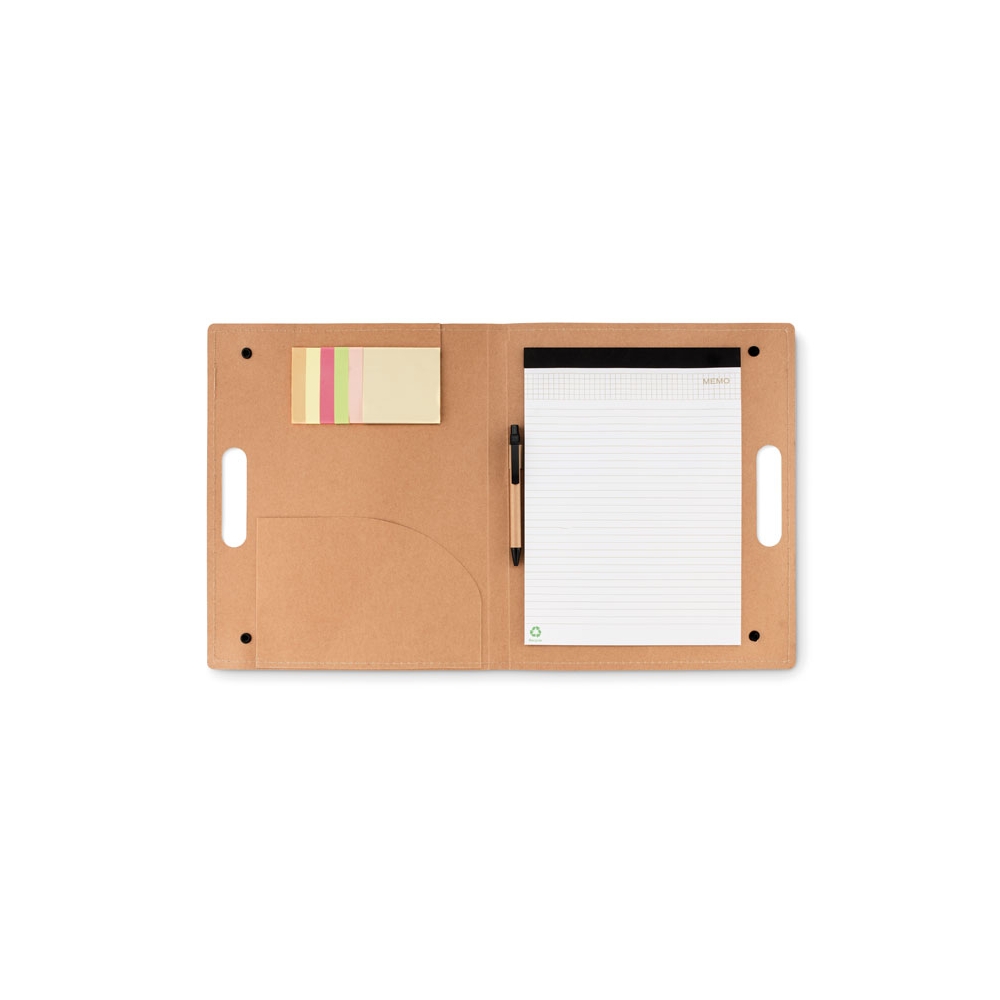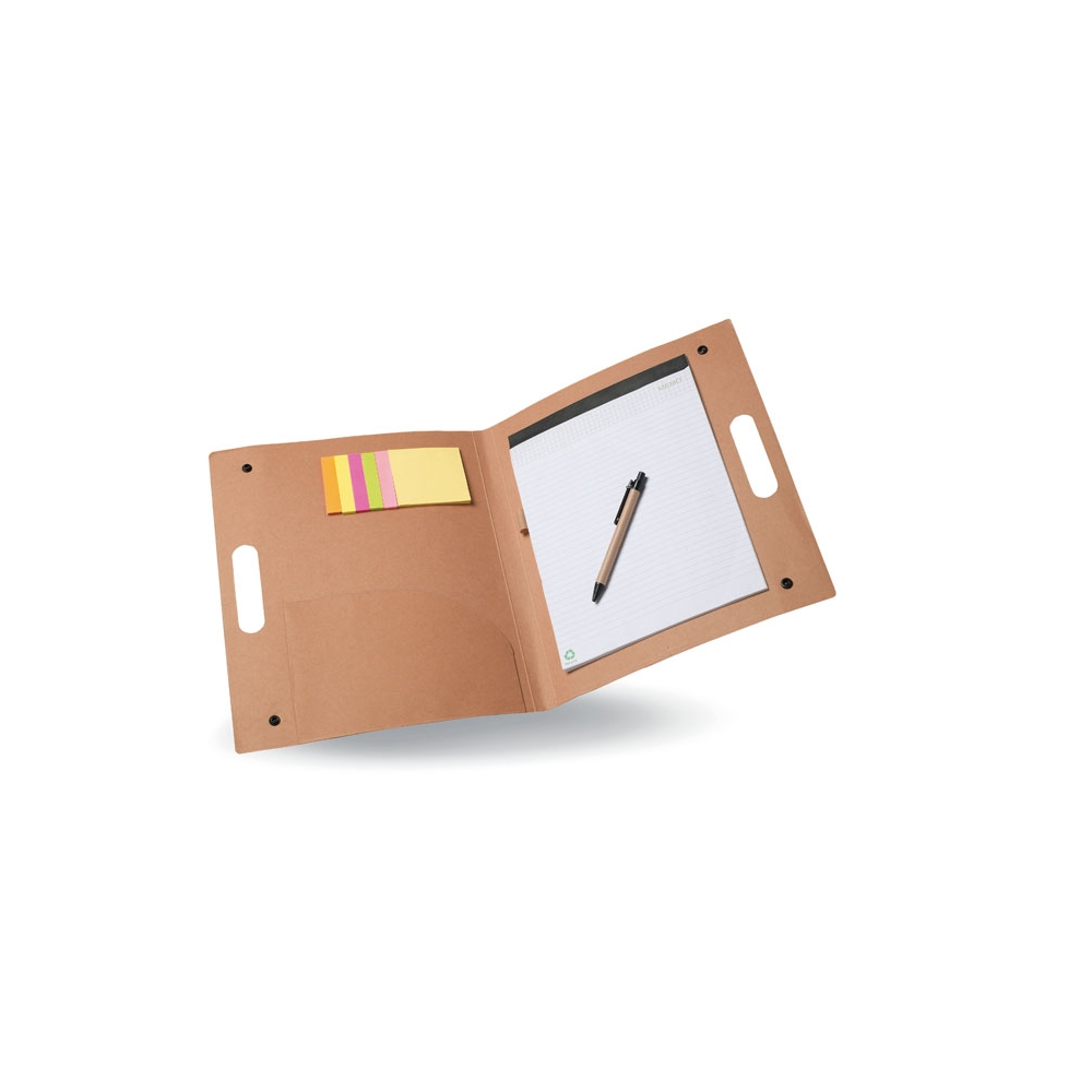 Artikel-Nr: OCBMO7411-13Schreibmappe aus recyceltem Karton mit Druckknopfverschluss. Ausgestanzte Griffe. Inkl. Block mit 20 Blatt liniertem Papier, gelben Haftnotizen sowie 5 farbigen Markerblöcken. Innenfach. Druckkugelschreiber mit Papierschaft. Stiftschlaufe. Blaue Tinte.
