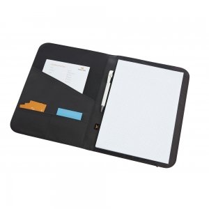 Artikel-Nr: HLF1813068-187Schwarze Schreibmappe mit Organizer-Elementen; verschließbar mit farbigem Gummiband; inkl. Schreibblock; flaches Einsteckfach; Gummischlaufe für Kugelschreiber