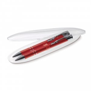Artikel-Nr: ART82221N0020Schreibset mit dem Kugelschreiber Alicante (87915) und dem Druckbleistift Alicante (89216) in einer oval transparenten Geschenkverpackung (83006). Werbeanbringung Standard auf beiden Schreibgeräten, jedoch auch auf der Verpackung möglich.