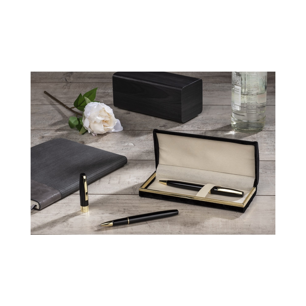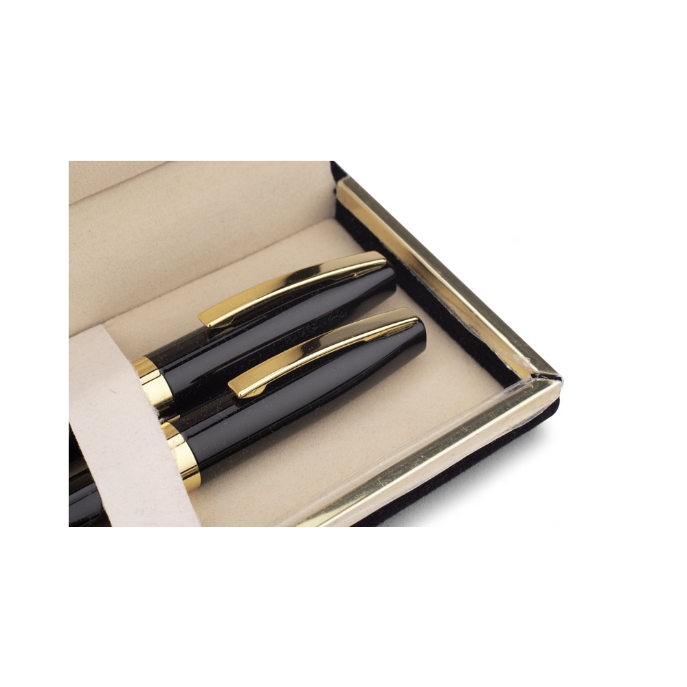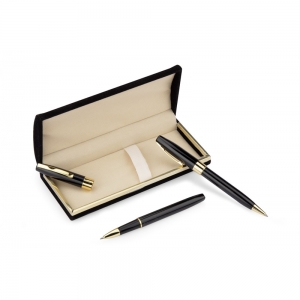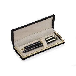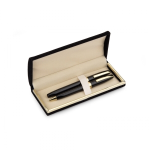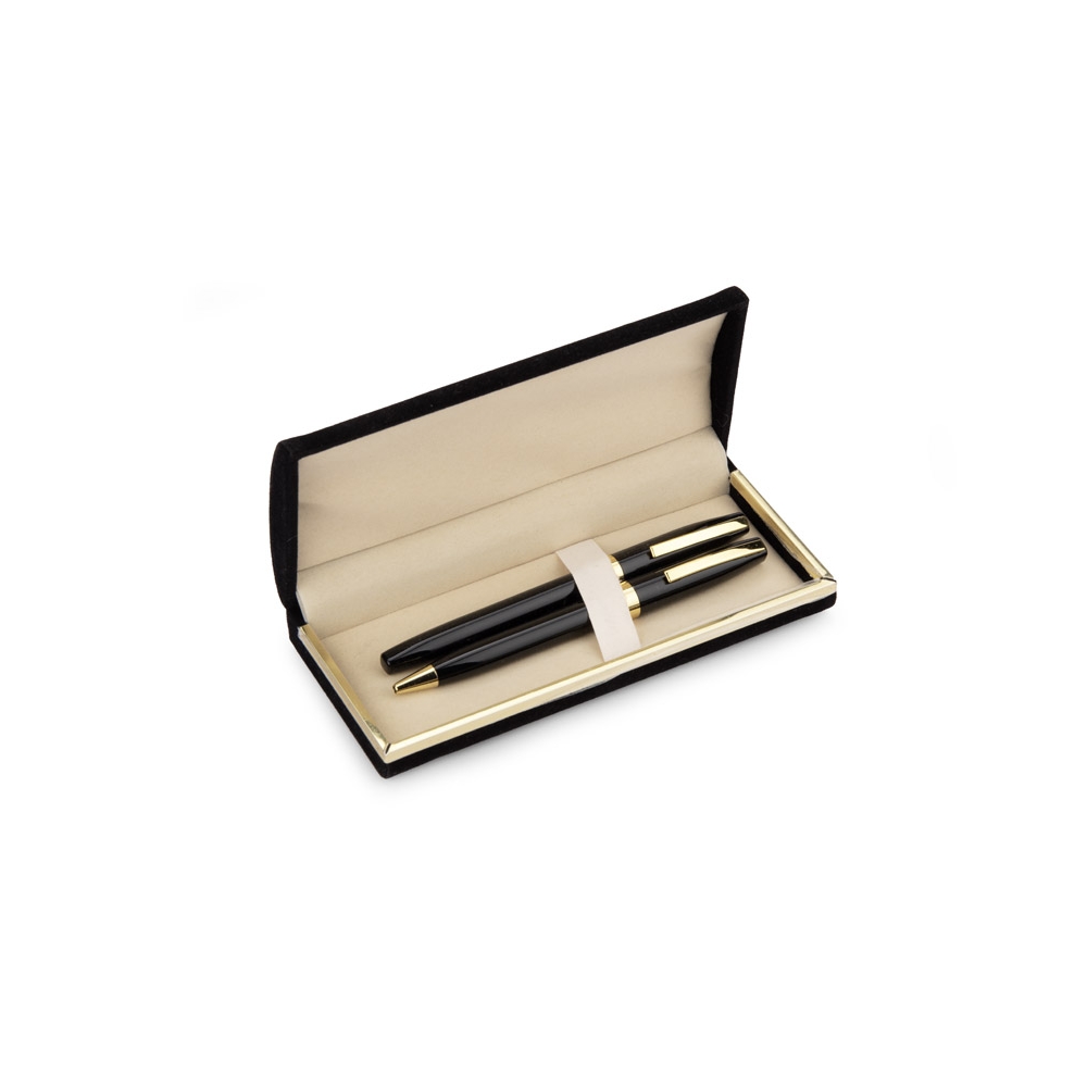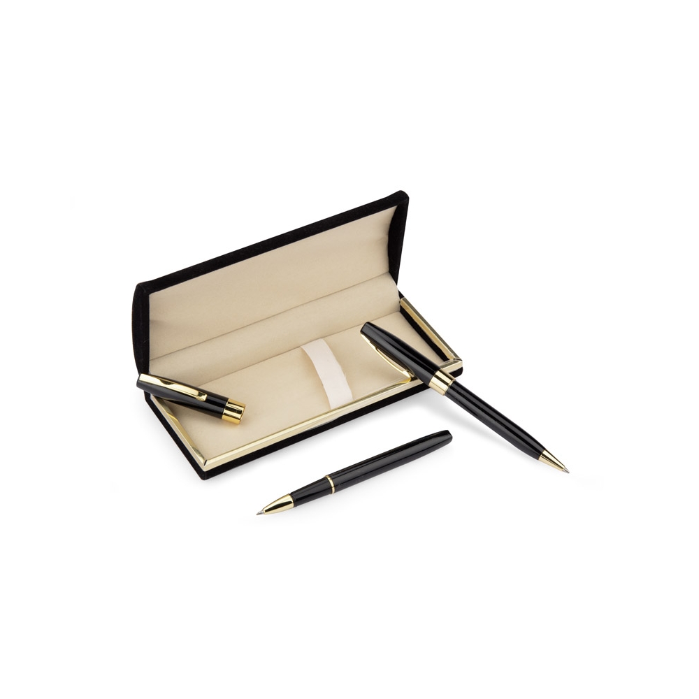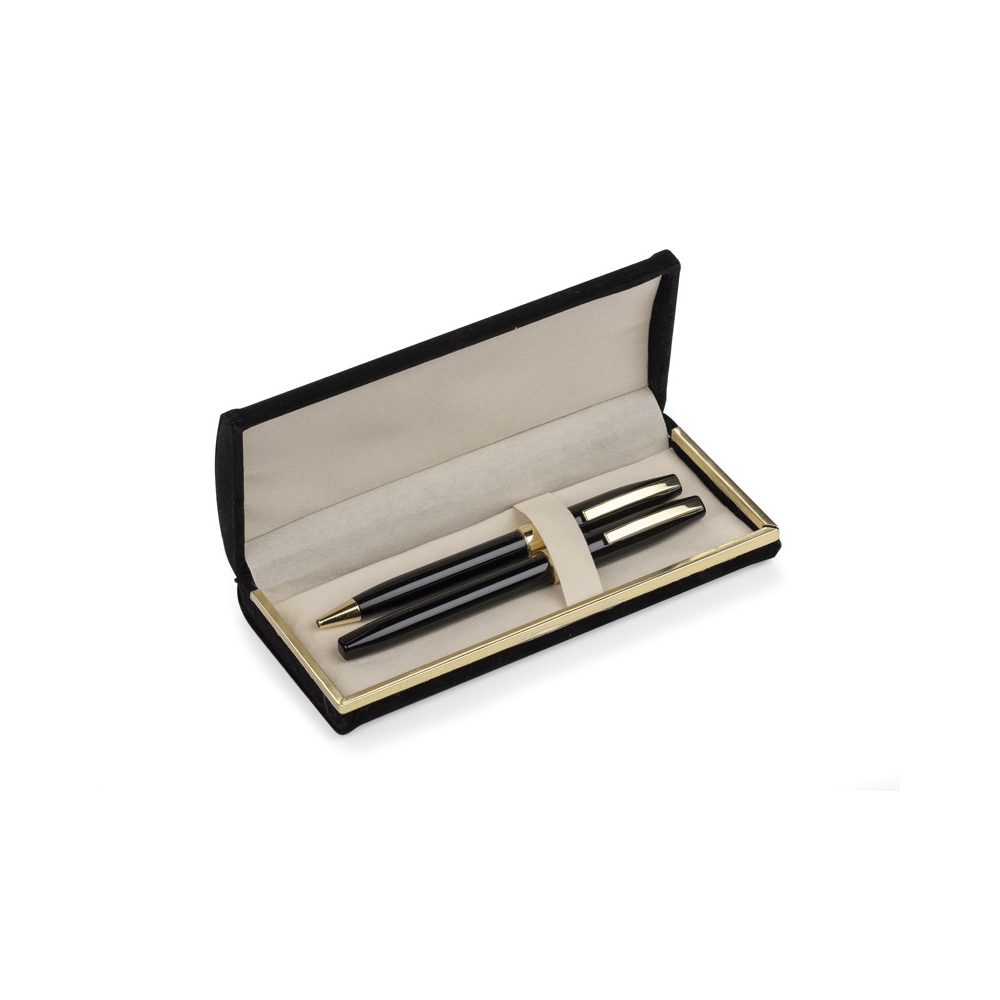 Artikel-Nr: ARD19219Schreibset mit goldenen Verzierungen im schwarzen, eleganten Samt Etui verpackt. Set besteht aus einem Kugelschreiber und Tintenroller. Logo wird in goldene Farbe auf dem Kugelschreiber und dem Tintenroller obenherum engraviert.