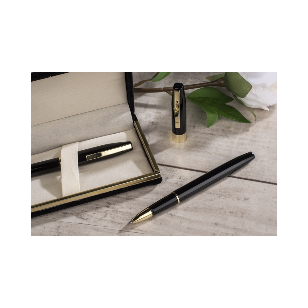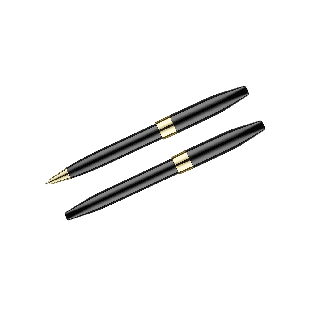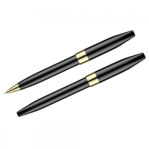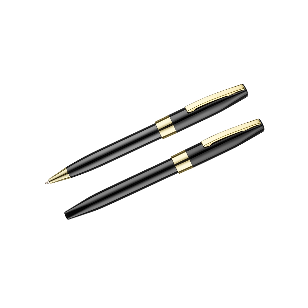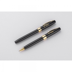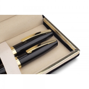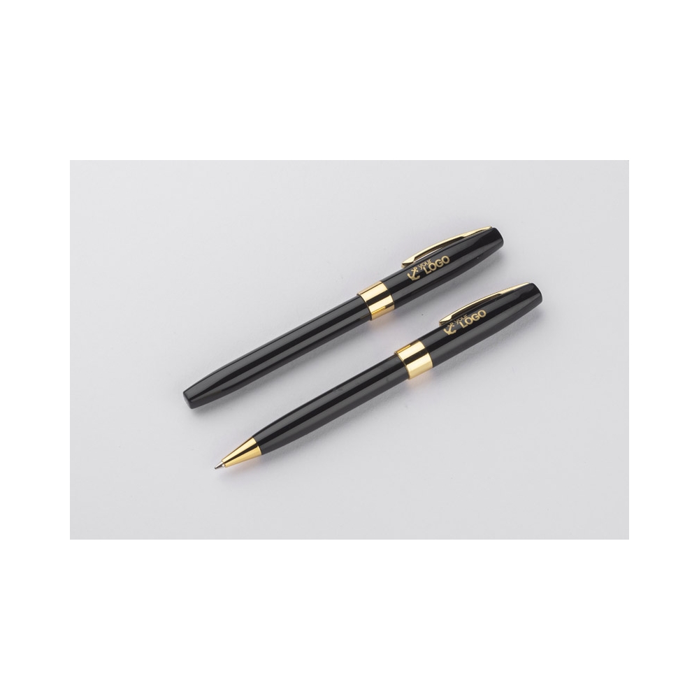 Artikel-Nr: ARD19219Schreibset mit goldenen Verzierungen im schwarzen, eleganten Samt Etui verpackt. Set besteht aus einem Kugelschreiber und Tintenroller. Logo wird in goldene Farbe auf dem Kugelschreiber und dem Tintenroller obenherum engraviert.