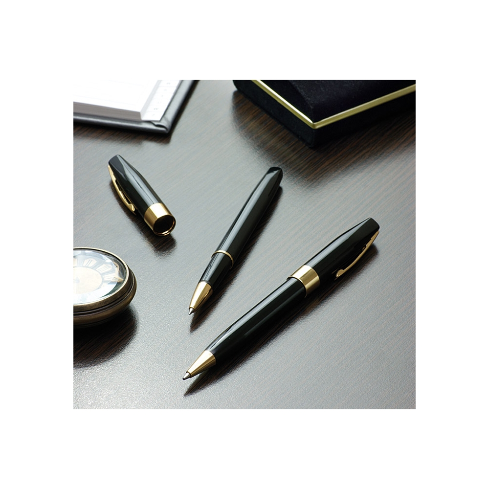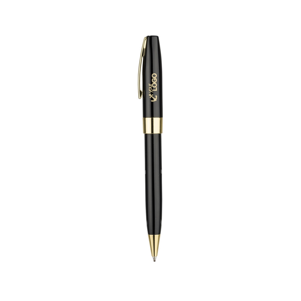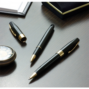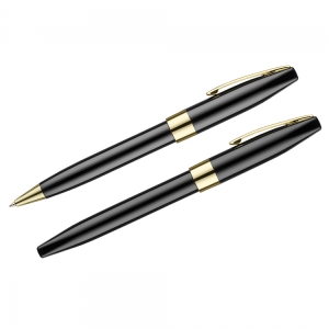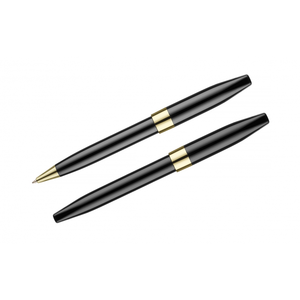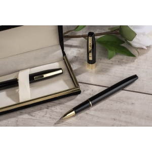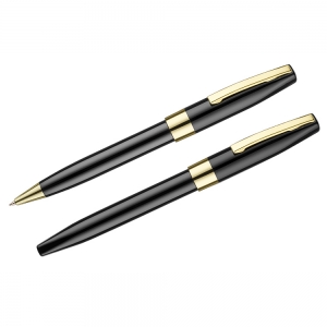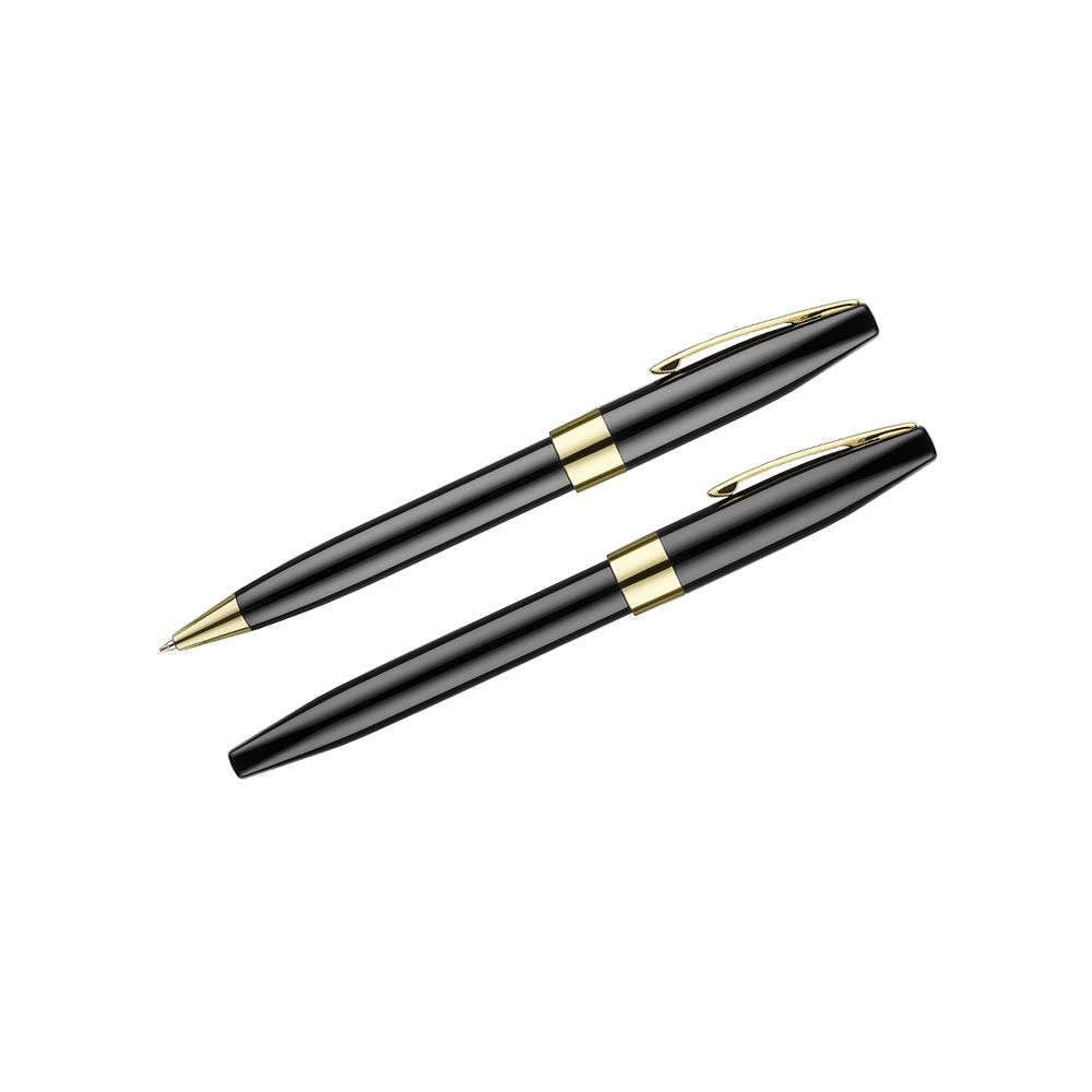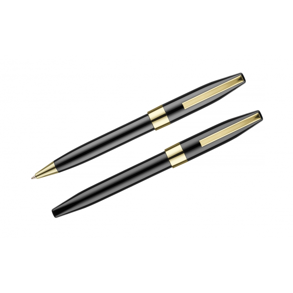 Artikel-Nr: ARD19219Schreibset mit goldenen Verzierungen im schwarzen, eleganten Samt Etui verpackt. Set besteht aus einem Kugelschreiber und Tintenroller. Logo wird in goldene Farbe auf dem Kugelschreiber und dem Tintenroller obenherum engraviert.