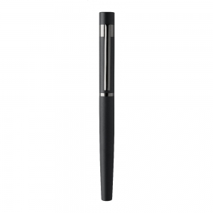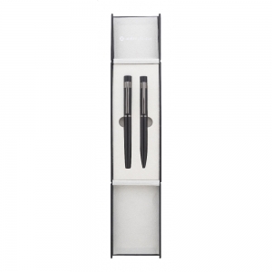 Artikel-Nr: AND800134-10Elegantes Kugelschreiber- und Tintenroller-Set aus Metall mit glänzenden Gunmetal-Details, blauschreibend. In farblich abgestimmter Geschenkbox. Marke: André Philippe.
