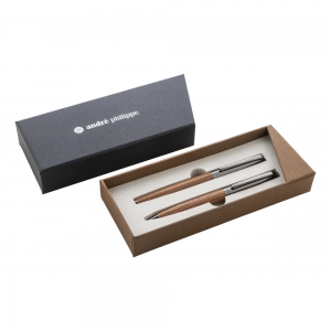 Artikel-Nr: AND800137Elegantes Kugelschreiber- und Tintenroller-Set aus Metall mit Holzschaft und glänzenden Gunmetal-Details, blauschreibend. In zweifarbiger Geschenkbox. Marke: André Philippe.