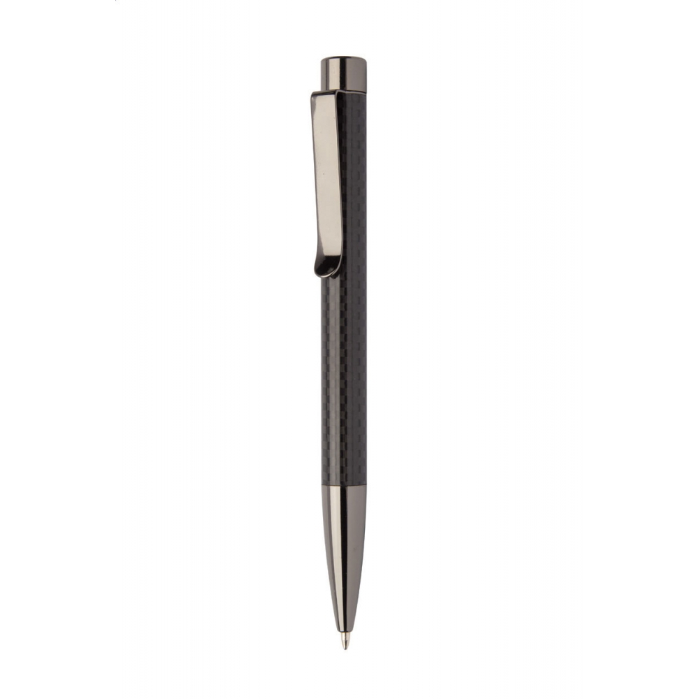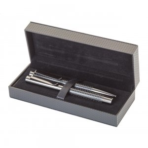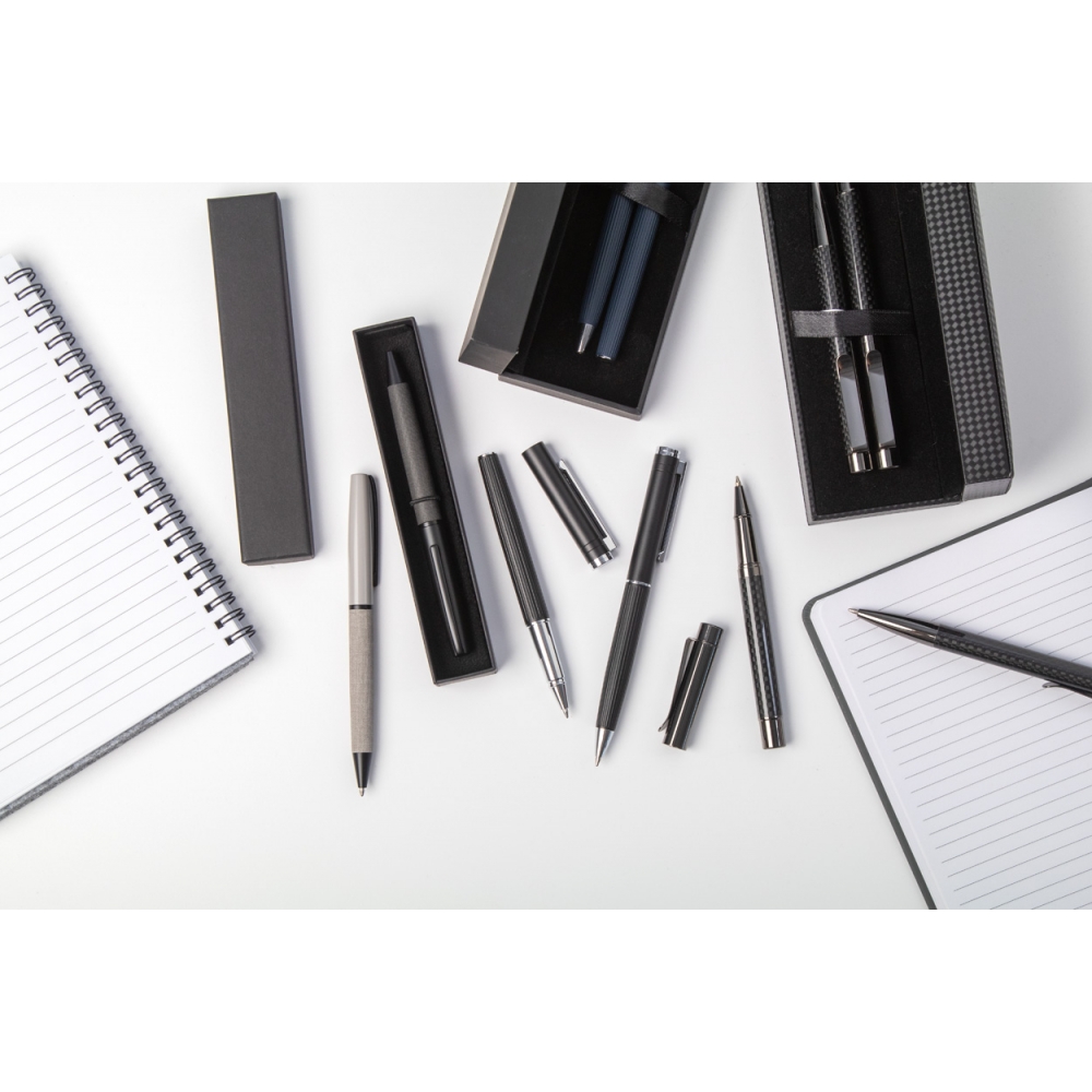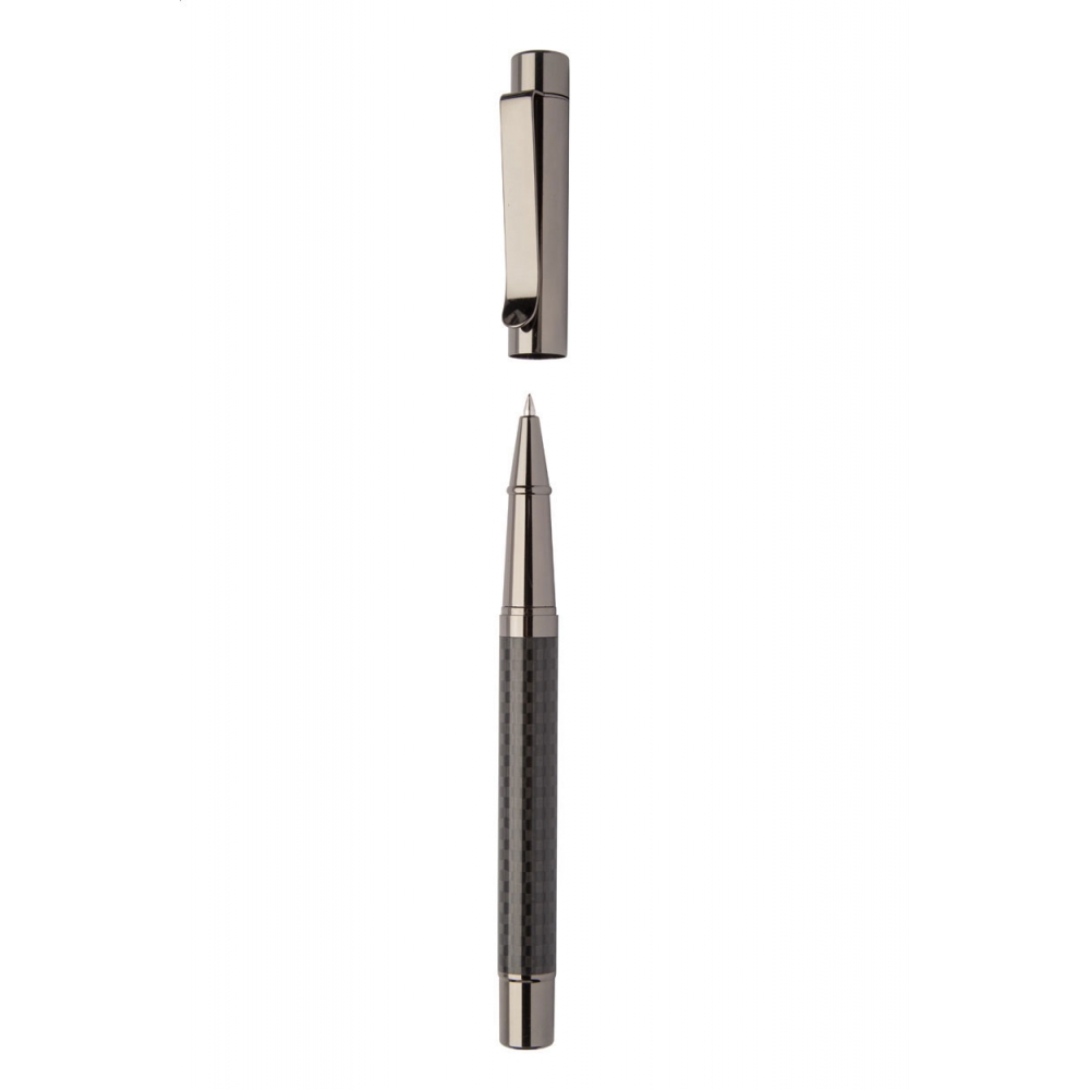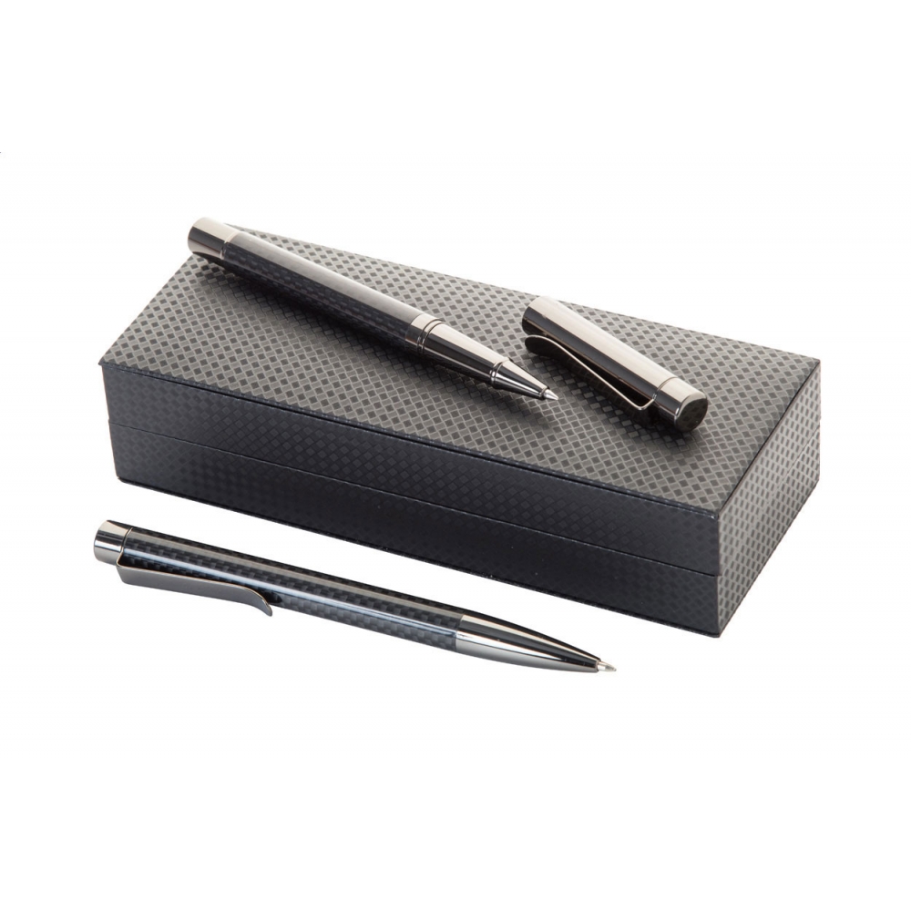 Artikel-Nr: AND800736-10Elegantes Kugelschreiber- und Tintenroller-Set aus Metall. Schaft in Karbonoptik und Applikationen in Gunmetal-Finish. In karbongemusterter Geschenkbox, mit blauschreibender Mine.