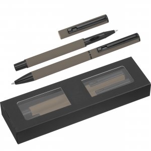 Artikel-Nr: EAG533477Schreibset aus Aluminium bestehend aus einem schwarzschreibenden Rollerball und einem blauschreibenden Drehkugelschreiber (Kunststoffgroßraummine) und einer Box. Ihre Werbung bringen wir mittels einer Lasergravur auf beiden Stiften in gleicher Größe an.