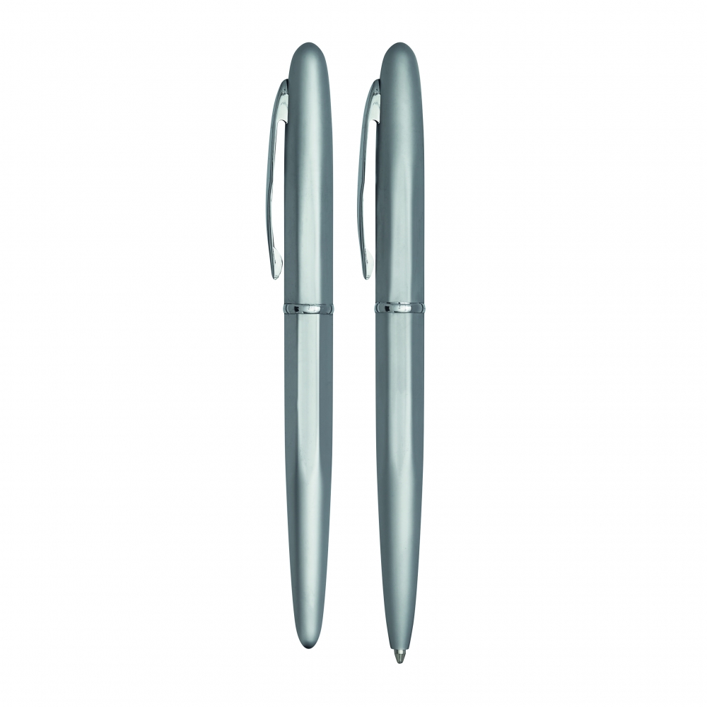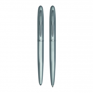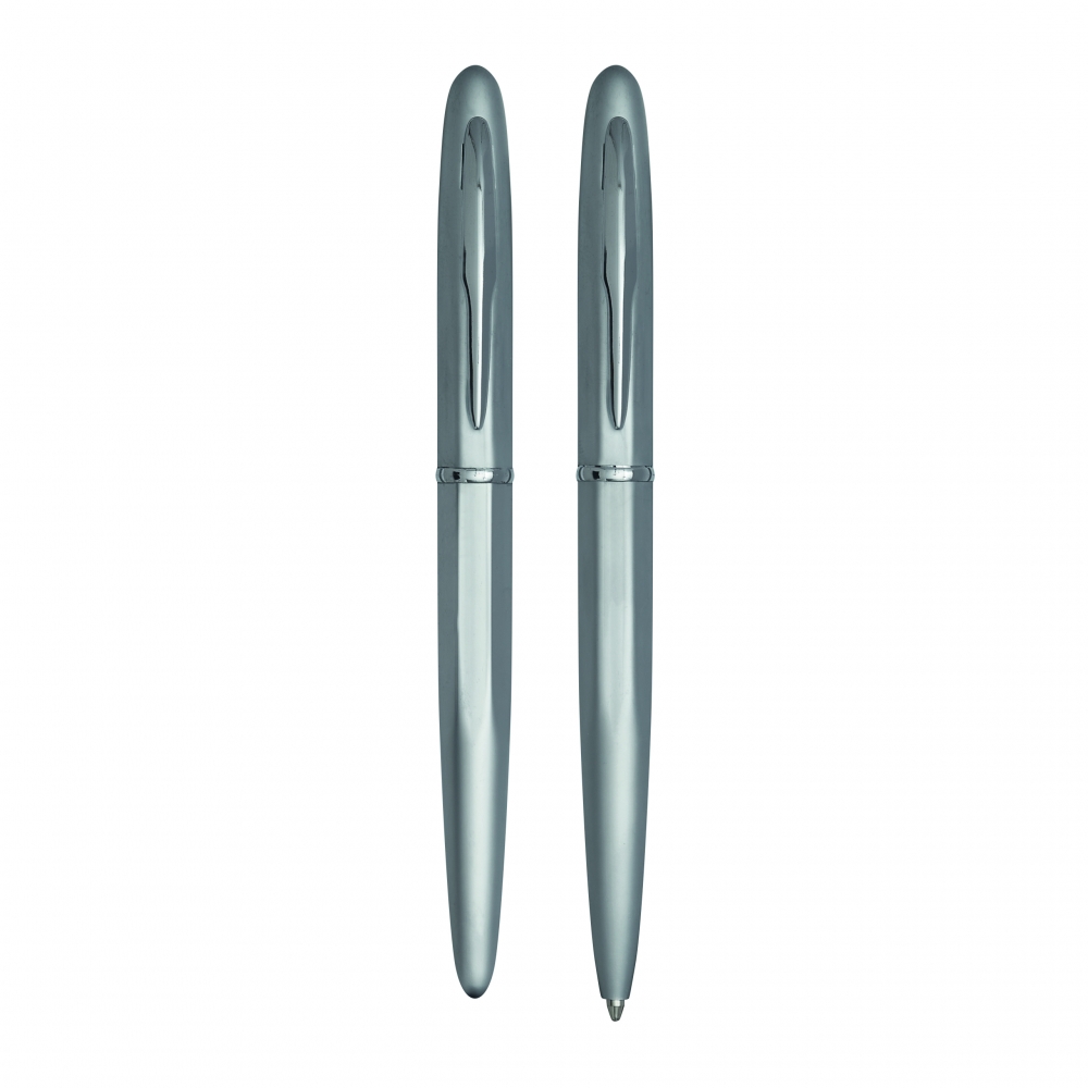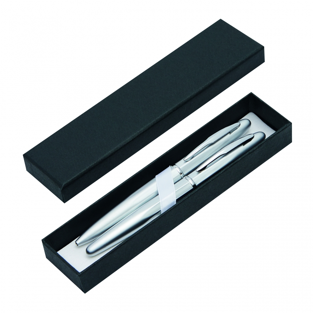 Artikel-Nr: INP58-1100464Schreibset COMTESSE: bestehend aus Metall-Tintenroller mit Verschlusskappe (schwarzschreibend) und Metall-Drehkugelschreiber (blauschreibend), mit hochglanz-verchromten Dekorelementen, Lieferung in Geschenkbox