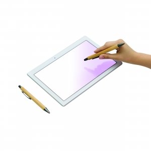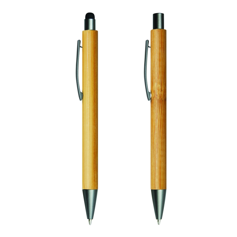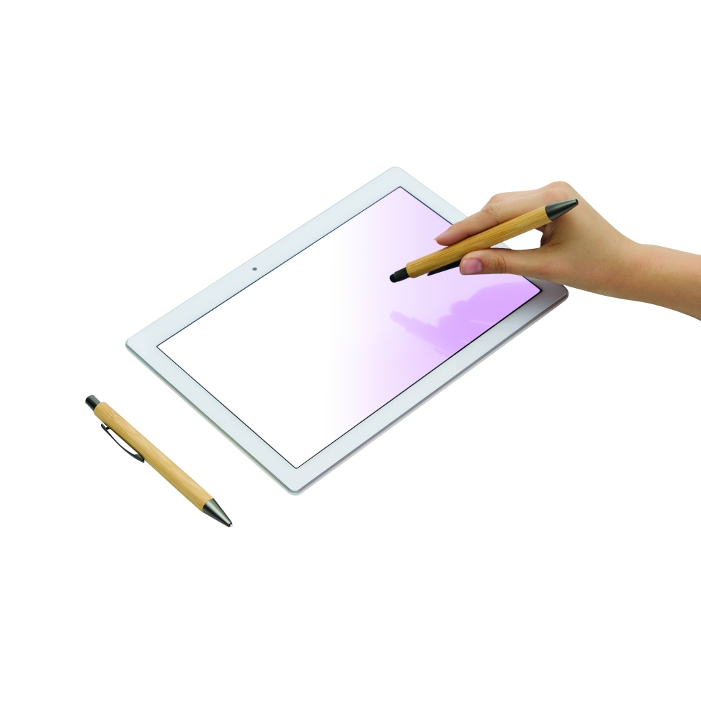 Artikel-Nr: INP56-1102108Schreibset DOUBLE BAMBOO REVISED, 2-teilig: bestehend aus Kugelschreiber mit Druckmechanismus, Großraummine und am Schaftende mit Touchscreen-Spitze (blauschreibend) sowie Druckbleistift, beide Schreibgeräte mit elegantem Bambus-Schaft, in Box