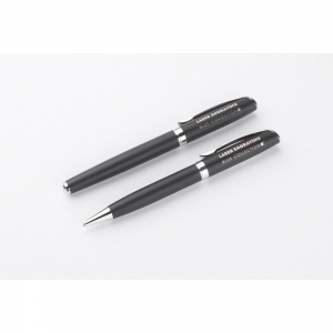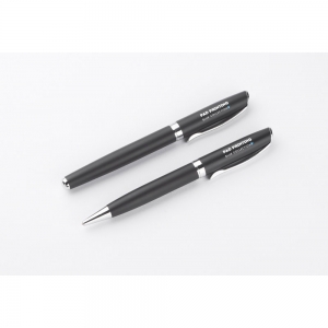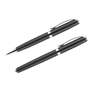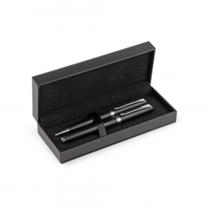 Artikel-Nr: ARD19622GEORGIA ist ein elegantes Schreibset, bestehend aus einem Kugelschreiber und einem Füllfederhalter. Die Schreibgeräte aus Metall sind in einem Etui aus schwarzem lederähnlichem Material (PU) verpackt. Kugelschreiber mit Drehmechanik. Der Füllfederhalter wird mit einer Tintenpatrone geliefert. Kugelschreibermine und Tintenpatrone in Schwarz, verpackt in einer schwarzen Kartonschachtel oder einer weißen Hülle.