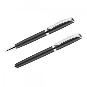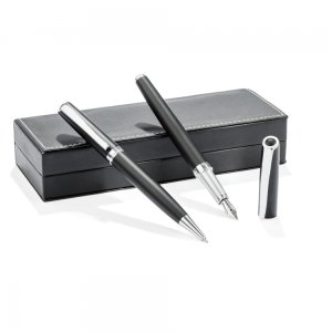Artikel-Nr: ARD19622GEORGIA ist ein elegantes Schreibset, bestehend aus einem Kugelschreiber und einem Füllfederhalter. Die Schreibgeräte aus Metall sind in einem Etui aus schwarzem lederähnlichem Material (PU) verpackt. Kugelschreiber mit Drehmechanik. Der Füllfederhalter wird mit einer Tintenpatrone geliefert. Kugelschreibermine und Tintenpatrone in Schwarz, verpackt in einer schwarzen Kartonschachtel oder einer weißen Hülle.